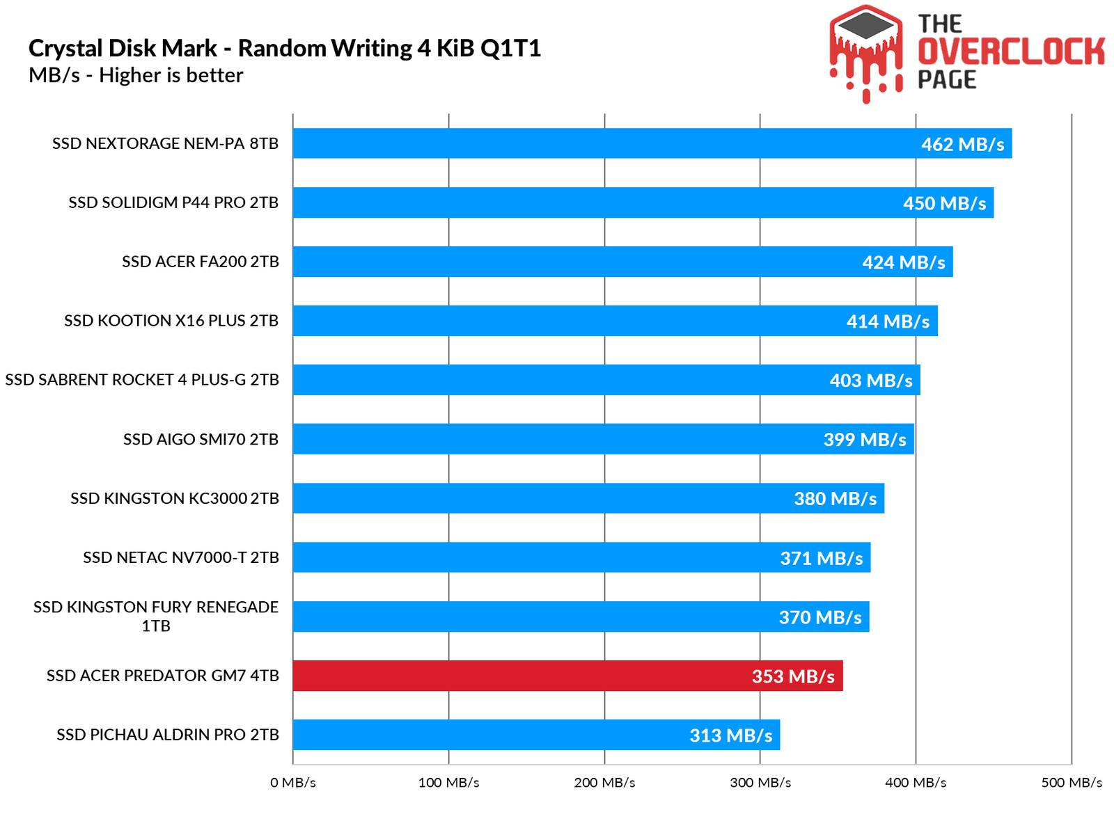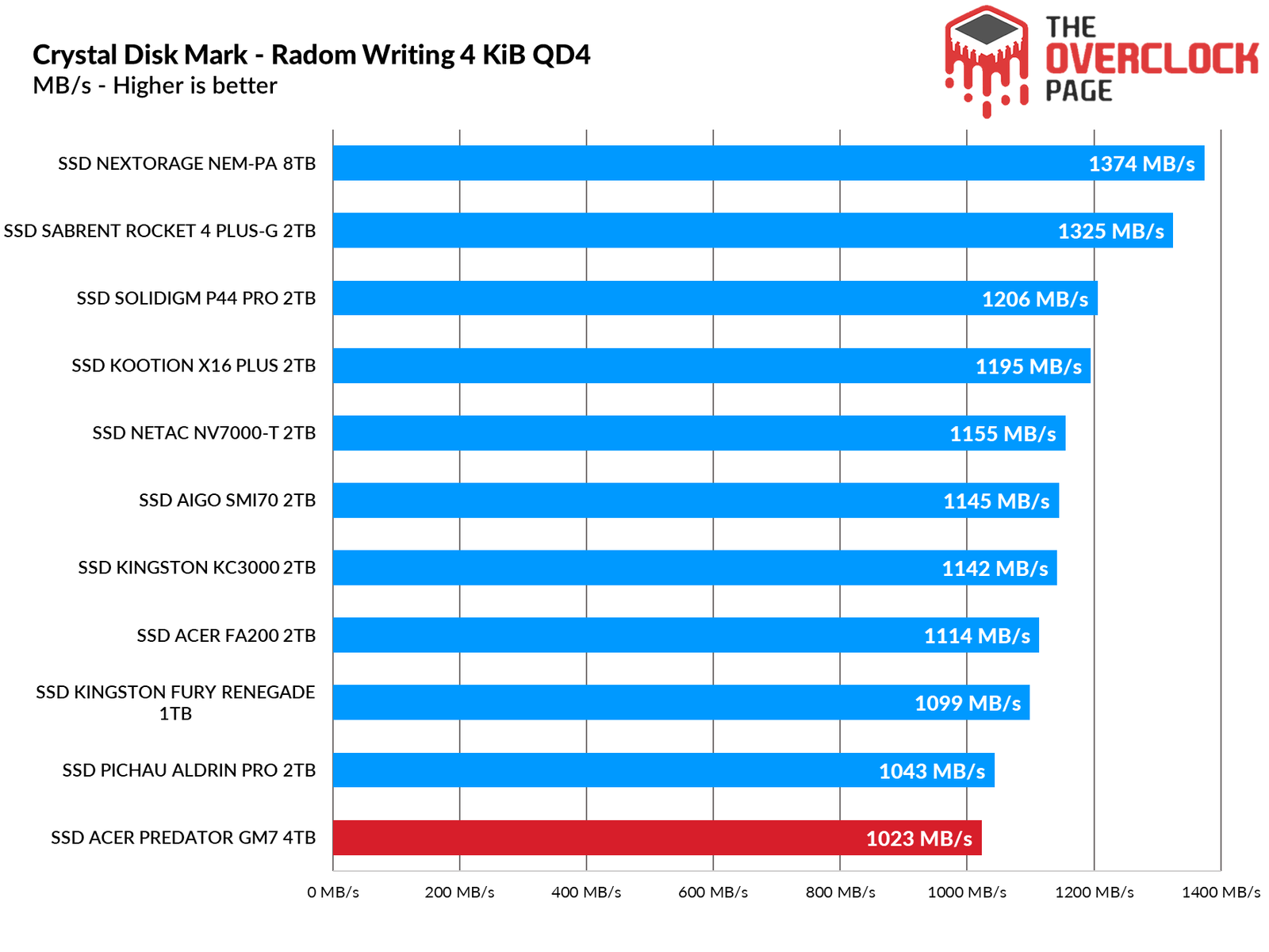 Its random read speeds at QD4 are decent and comparable to other SSDs using the MAP1602 controller. However, interestingly, it delivered the weakest write performance.
