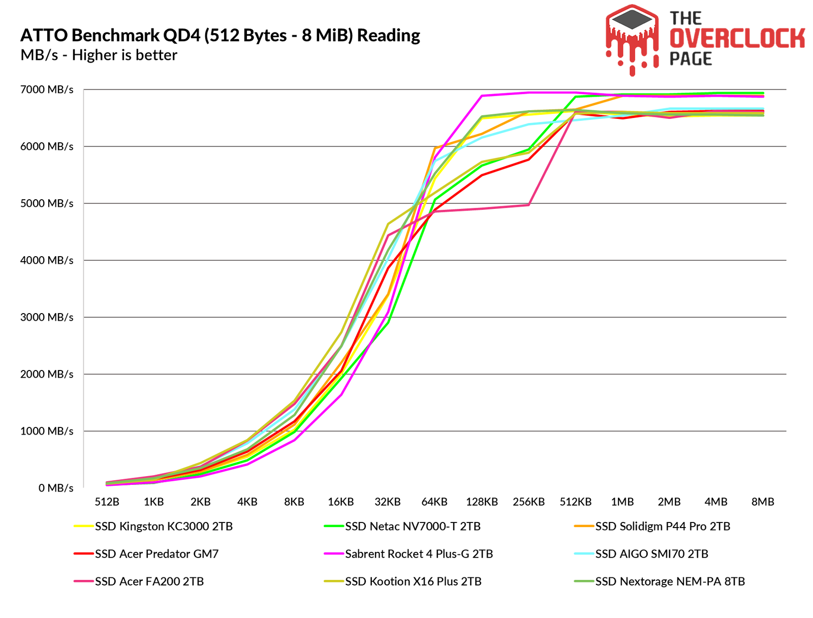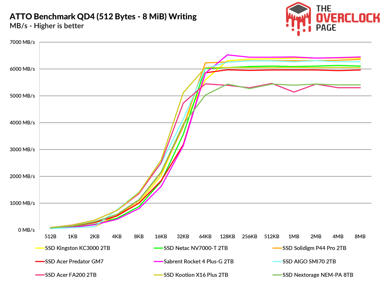 We conducted a test using ATTO to observe the speed of the SSDs with different block sizes. The benchmark was configured as follows:
