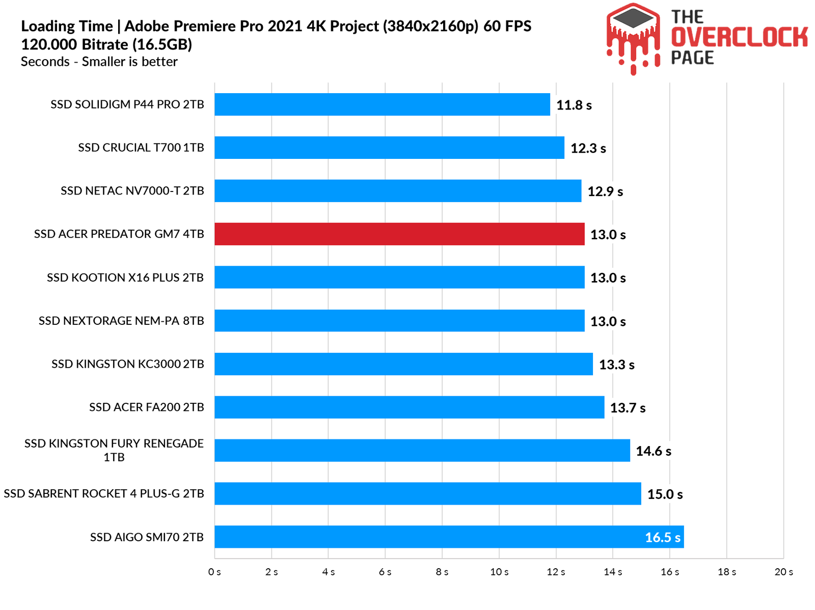 Next, we used Adobe Premiere to measure the average time it took to open a 16.5GB project in 4K resolution, with a bitrate of 120Mbps, full of effects, until it was ready for editing. It’s important to note that the tested SSD was always used as a secondary drive without the operating system installed, as having the OS on the same drive could affect the results and introduce inconsistencies.