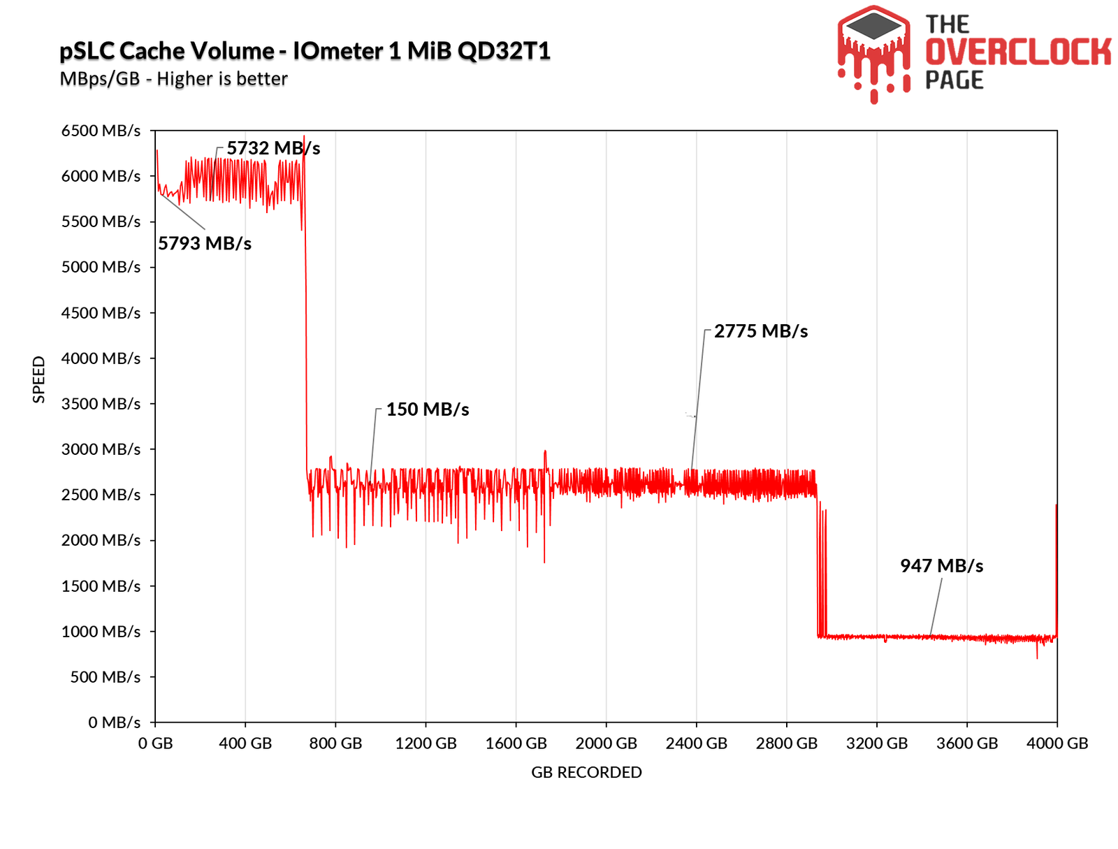 Using IOmeter, we can gauge the SLC cache volume of this SSD, as manufacturers often do not provide this information. From the tests we conducted, we determined that it has a dynamic pSLC cache volume of approximately 671GB, maintaining an average speed of about 5939MB/s until the buffer was exhausted.