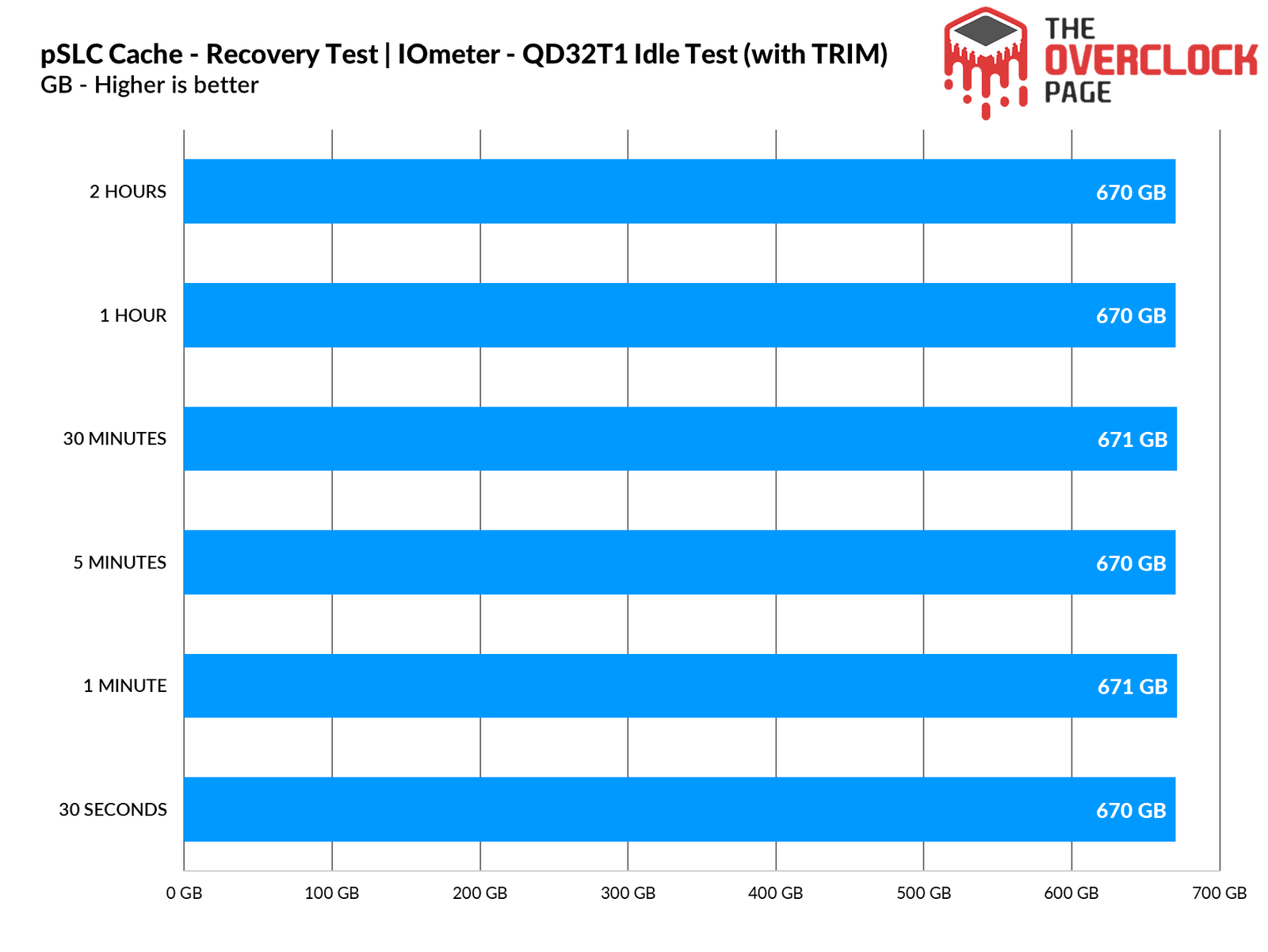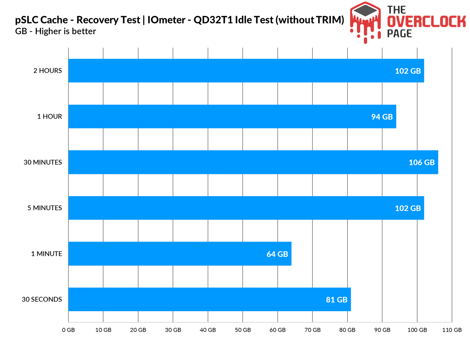 We also conducted a test to determine how long it would take for the SSD to recover part of its buffer. During our testing, which lasted from 30 seconds to 2 hours in idle, we compared scenarios using TRIM and garbage collection against those without TRIM/GC. In tests without TRIM/GC, we observed that the SSD managed to recover over 100GB in a short period, demonstrating that even in unrealistic situations, its firmware is well-optimized for recovery.