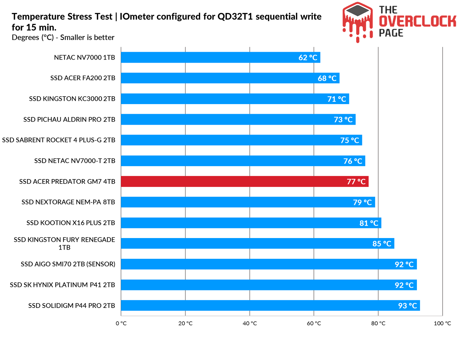 As noted above, this SSD has a default thermal limit ranging from 90°C to 95°C, which is reasonable. During testing, the SSD’s sensors indicated that it did not exceed 77°C and did not experience thermal throttling.
