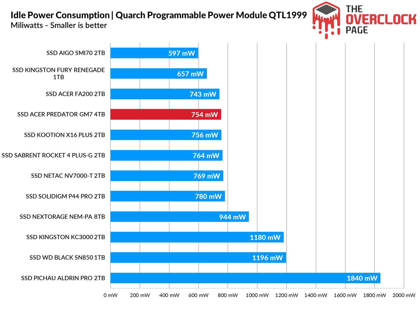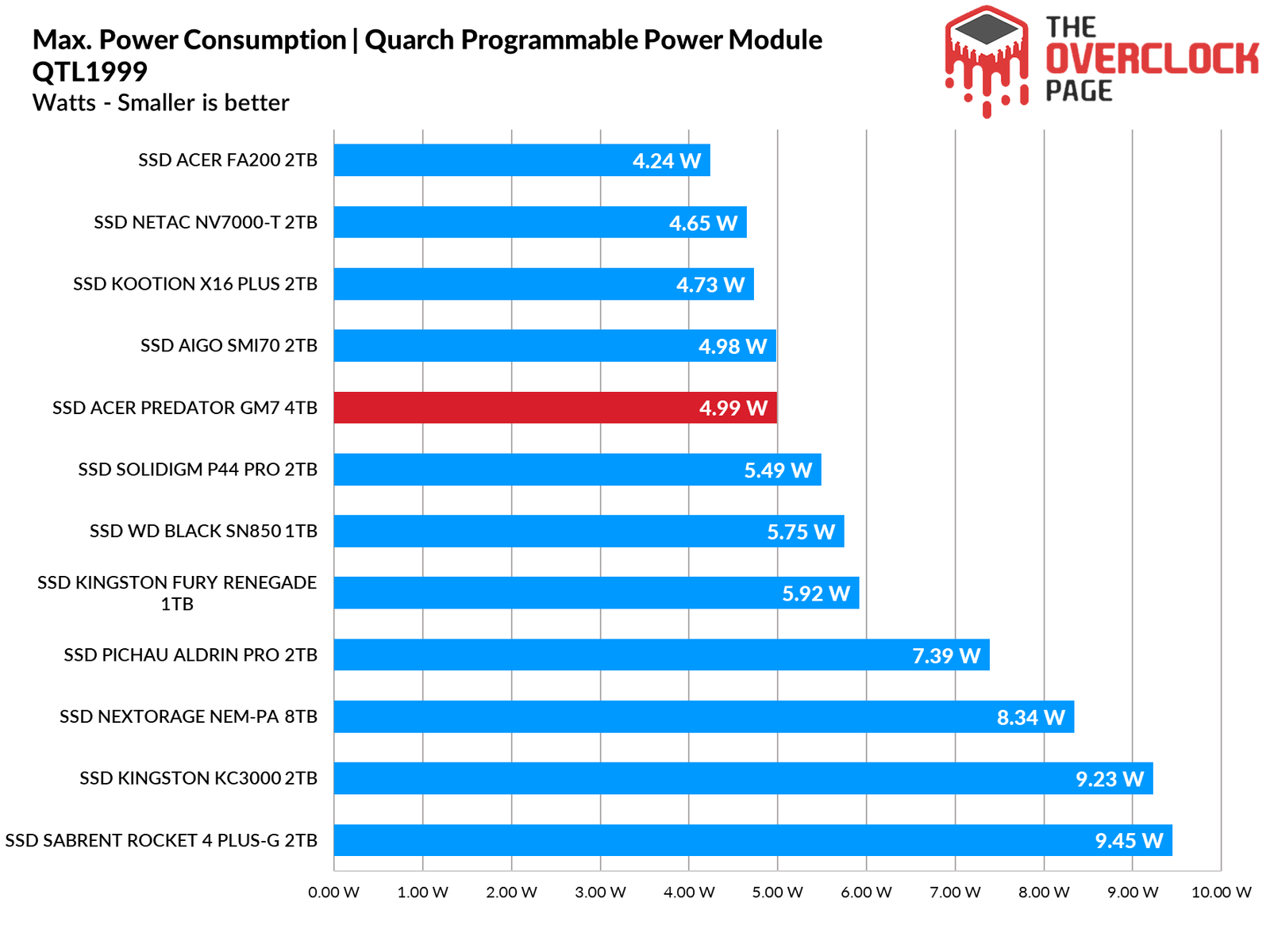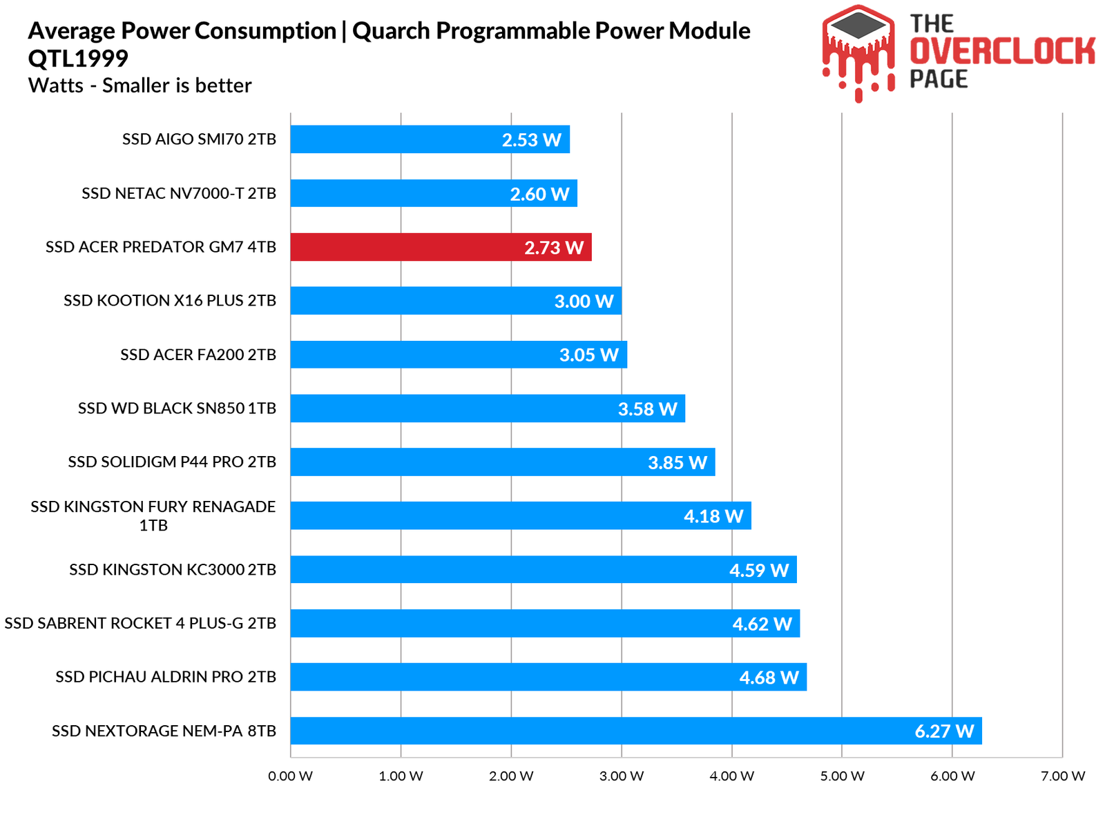 In our average consumption test battery, it once again surprised us with extremely low power consumption for an SSD of this density. Despite having twice the capacity of the NV7000-T and the SMI70 that we tested previously, it demonstrated remarkable efficiency.