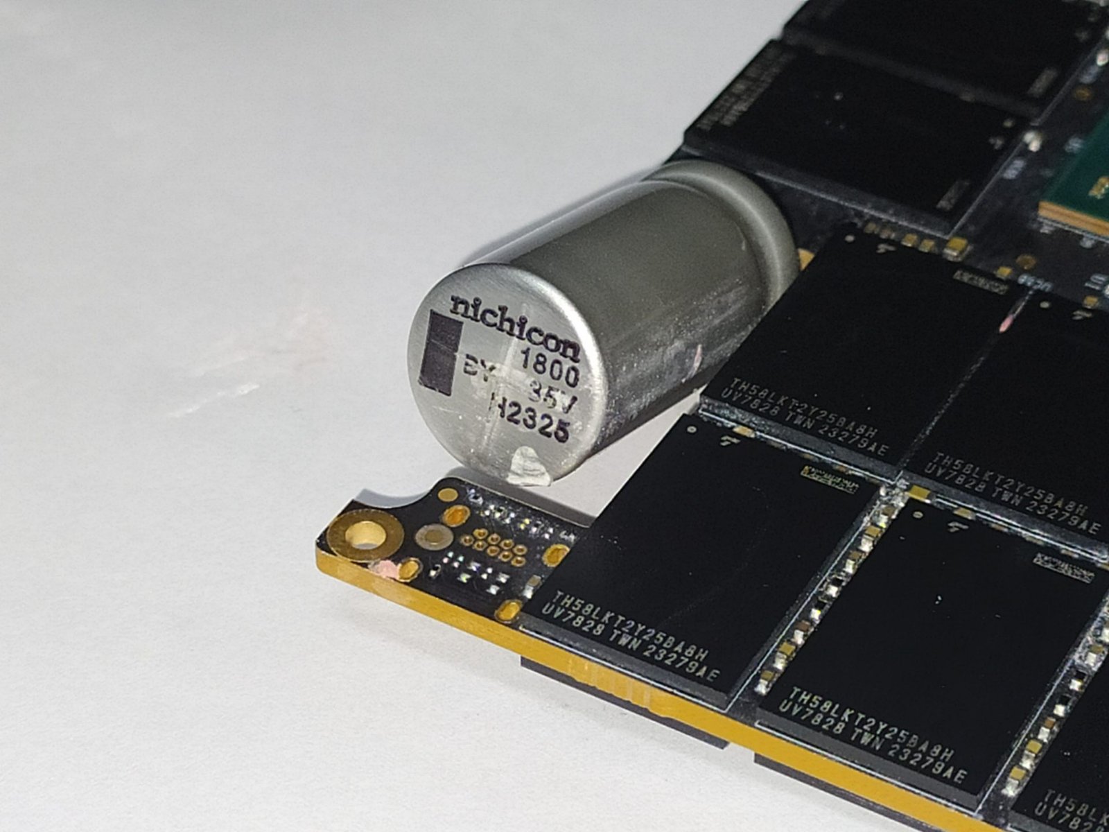 In the right image, we see the front of the PCB, which houses the controller, along with another five DRAM cache modules and eight additional NAND flash chips. There is also a considerable number of VRM components, as well as a large capacitor responsible for power-loss protection.