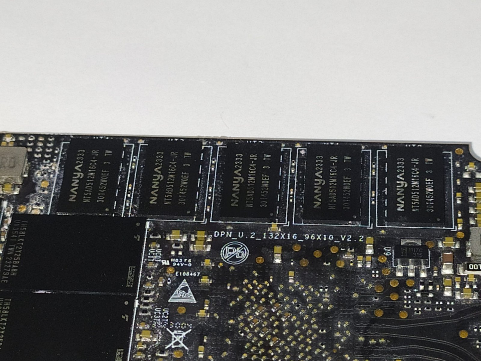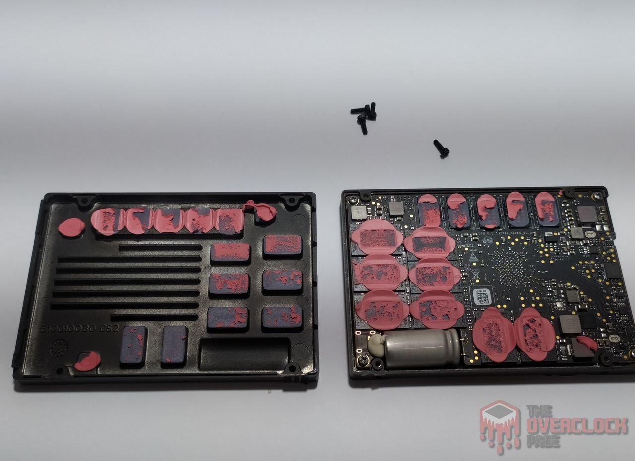 In the images above, we can see both sides of the PCB. In the left image, the back of the PCB is populated with components, including five DRAM cache modules, eight NAND flash chips, and numerous integrated circuits that make up the VRM.
