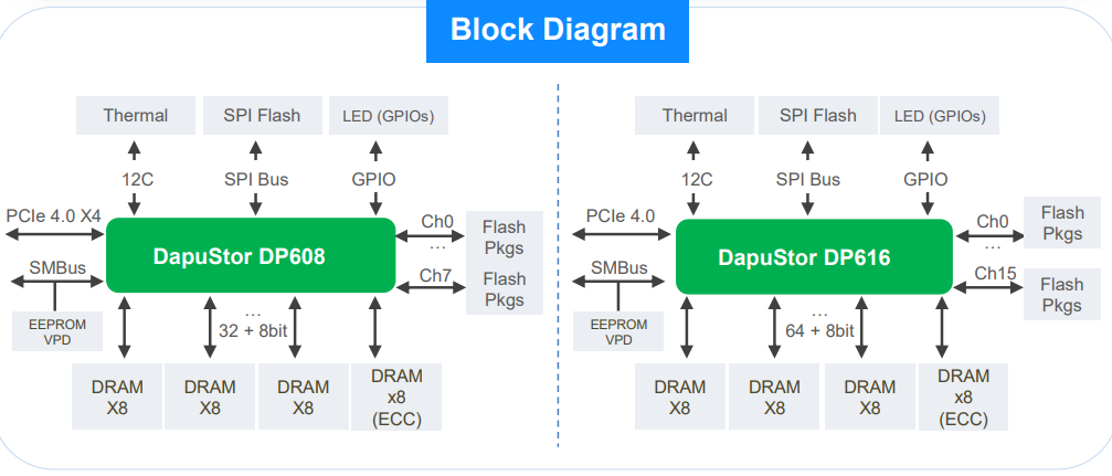 Most consumer-grade controllers, particularly high-end ones like the Phison E18 and Phison E26, support up to 32 dies (8 channels with 4 chip enables per channel). In contrast, the DPU616 supports 16 channels with 8 chip enables per channel, allowing up to 256 dies in interleaving. Meanwhile, the DPU608 supports up to 256 dies as well but with support for 64-C.E.