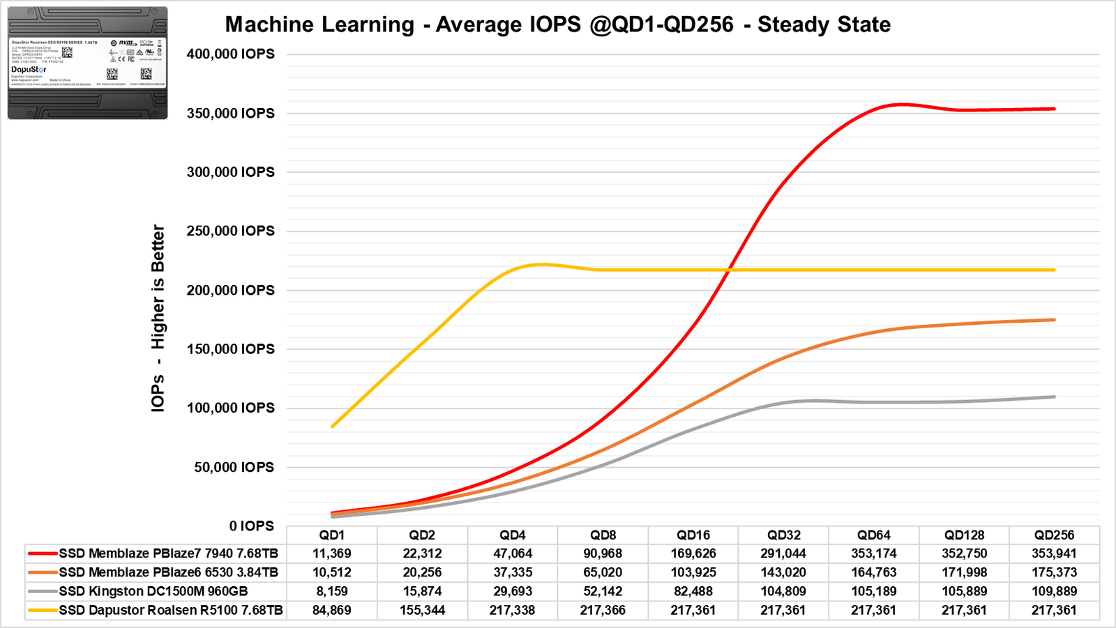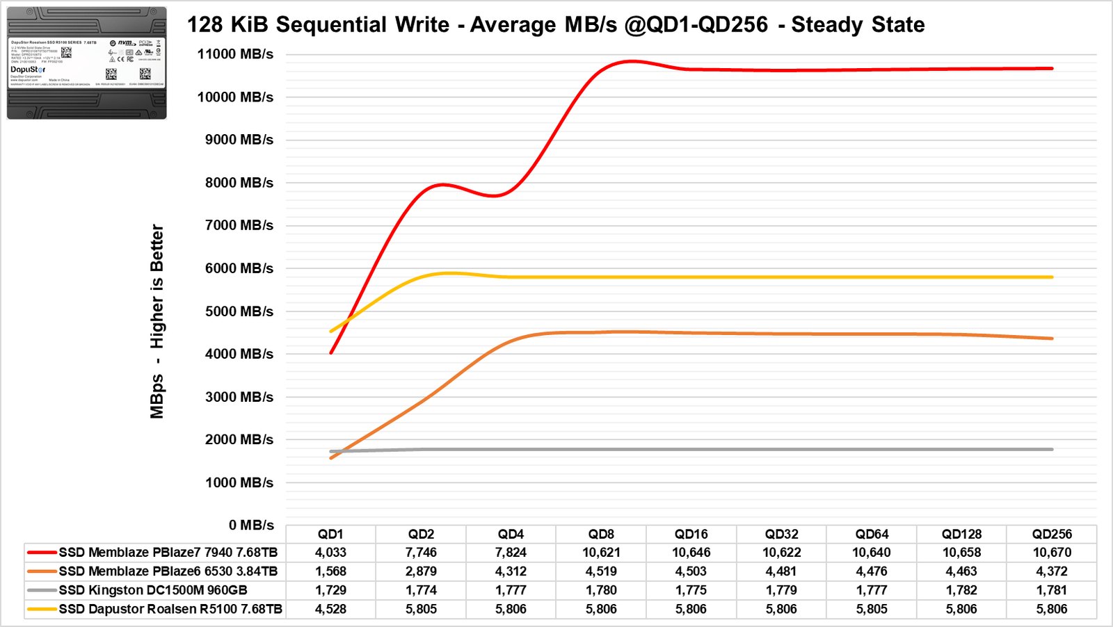 During this benchmark, we observed that the Dapustor performs excellently, coming slightly behind the Memblaze Gen5 and well ahead of the Gen4.