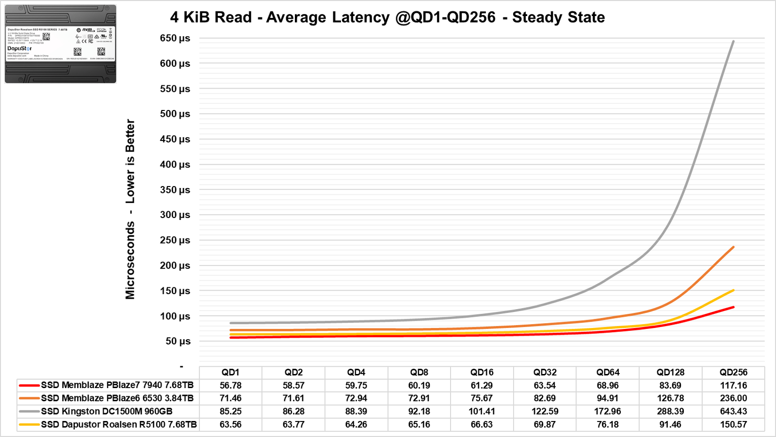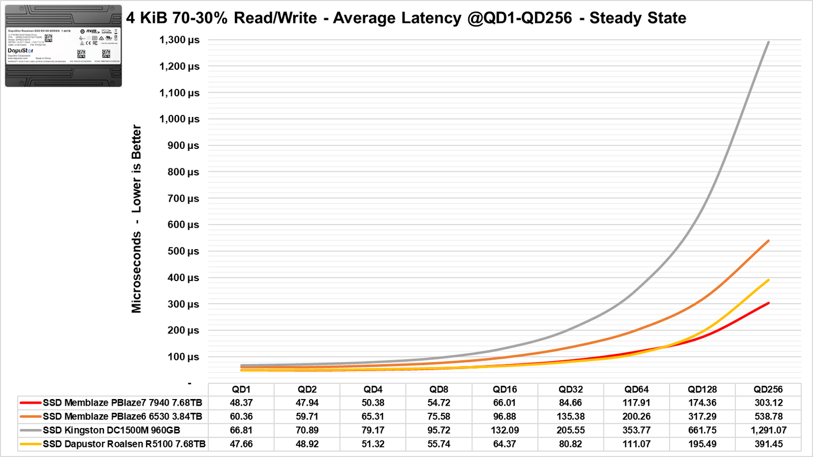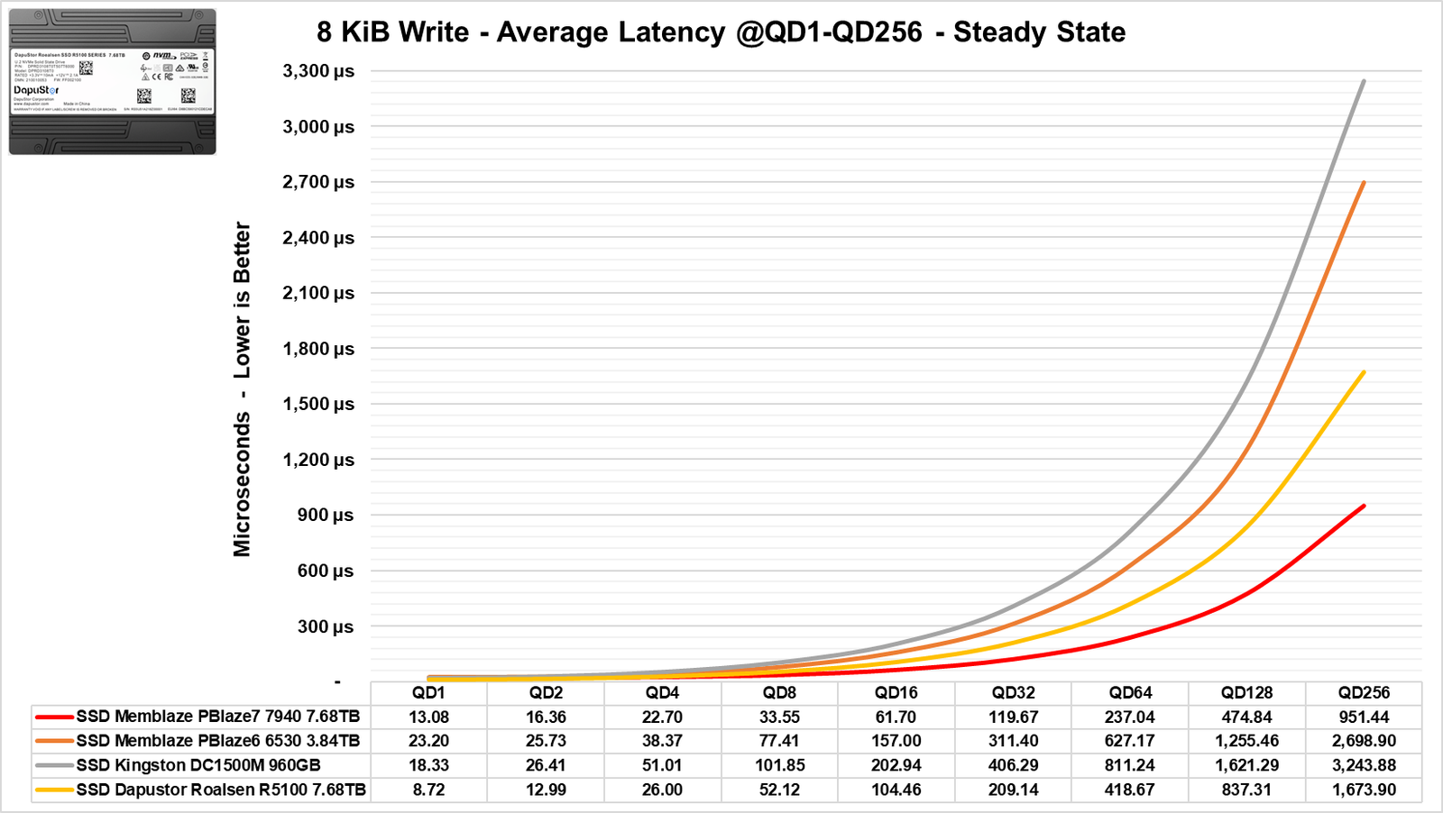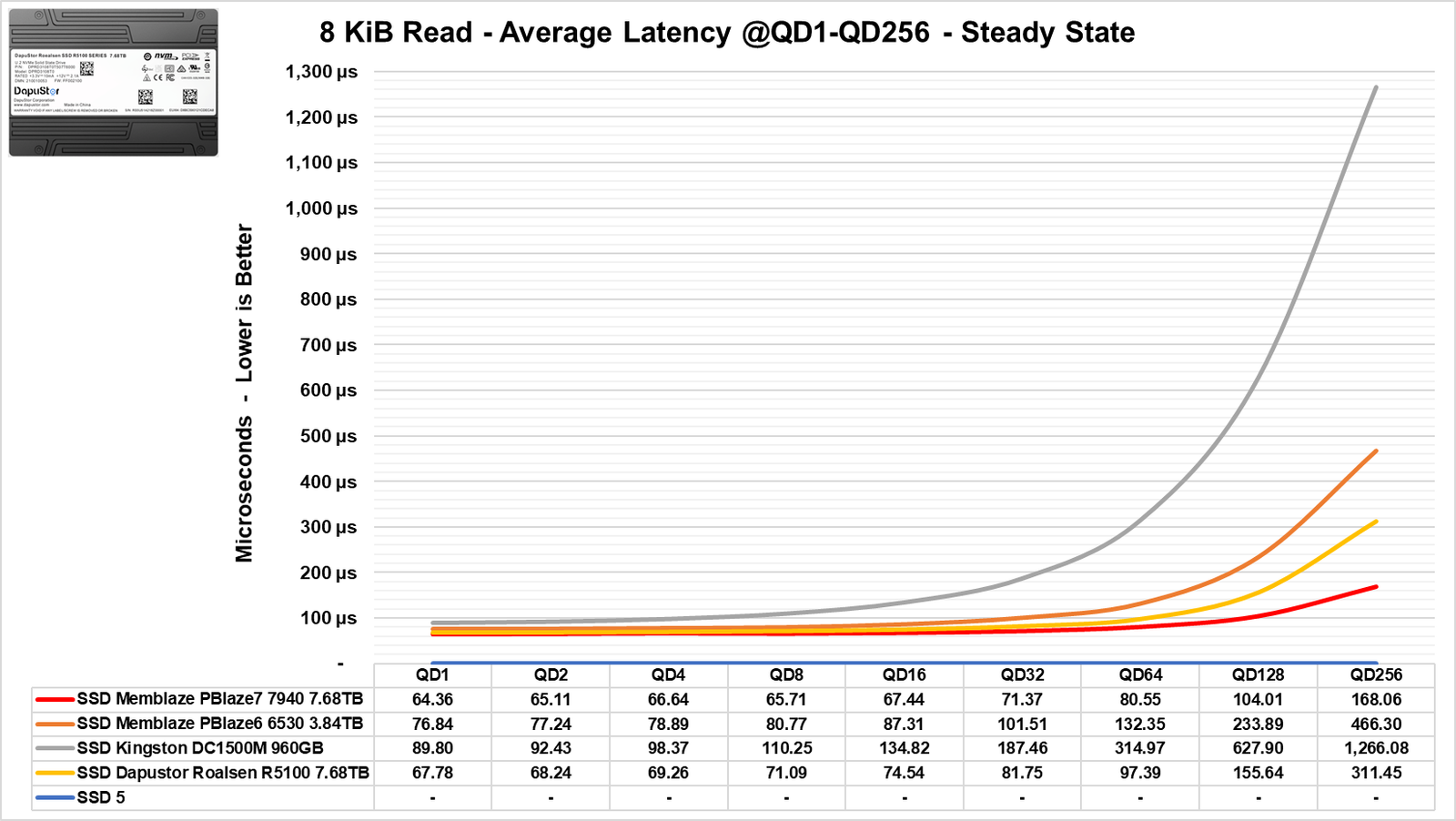 Regarding latencies, it is significantly lower than that of the Memblaze, with the Dapustor SSD being even close to the performance of a Gen5 SSD.