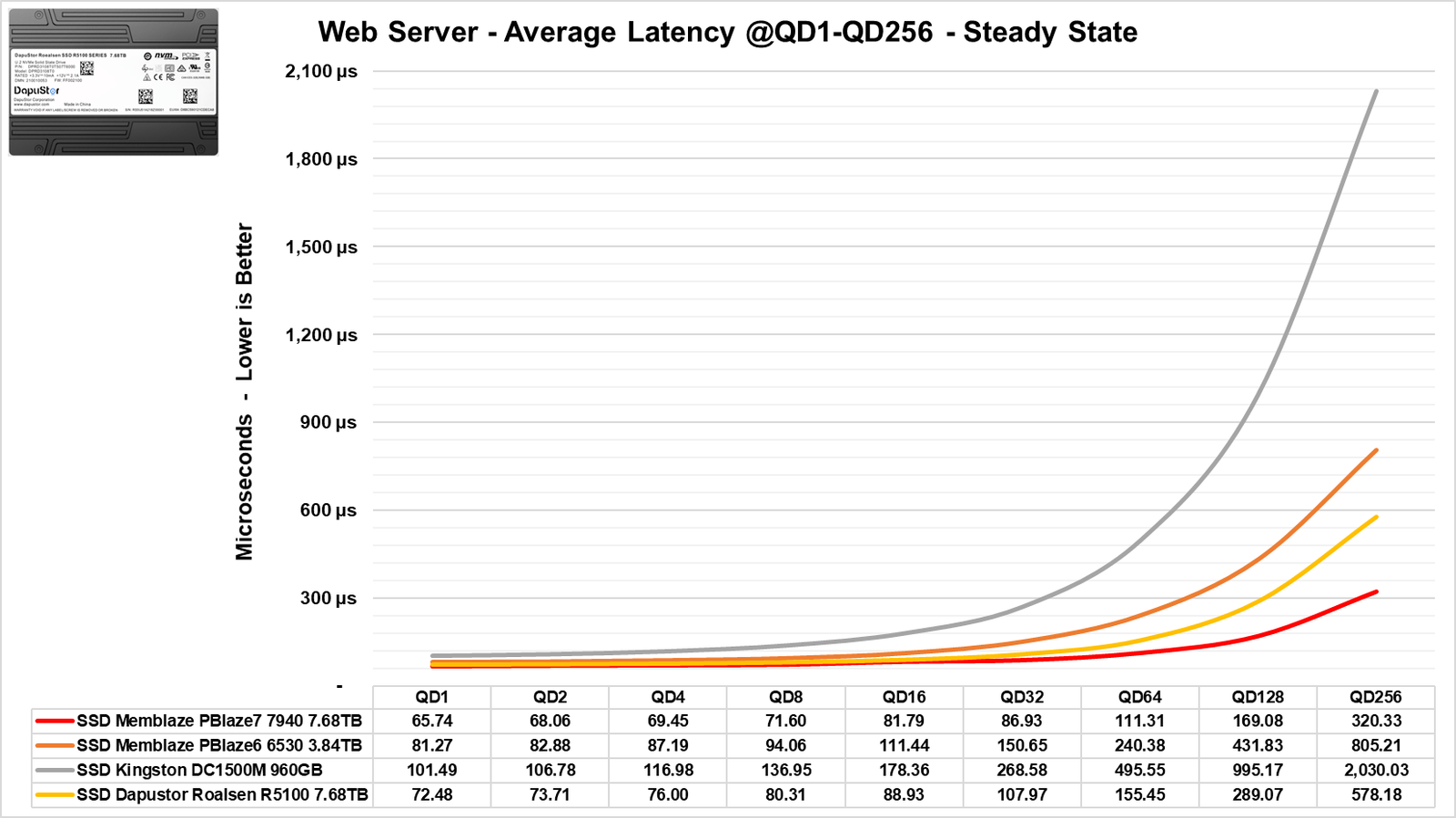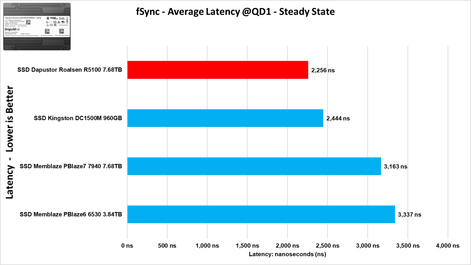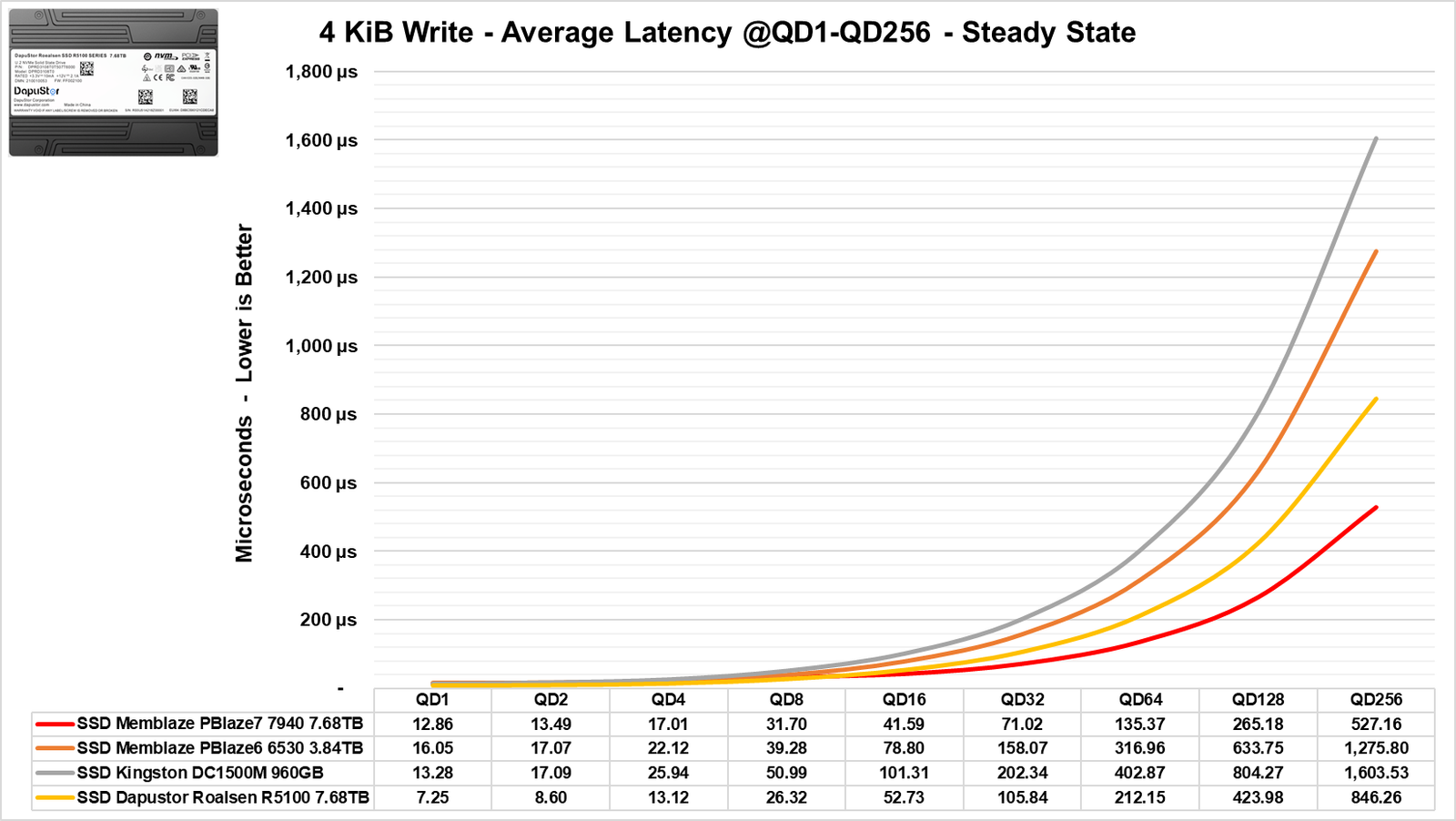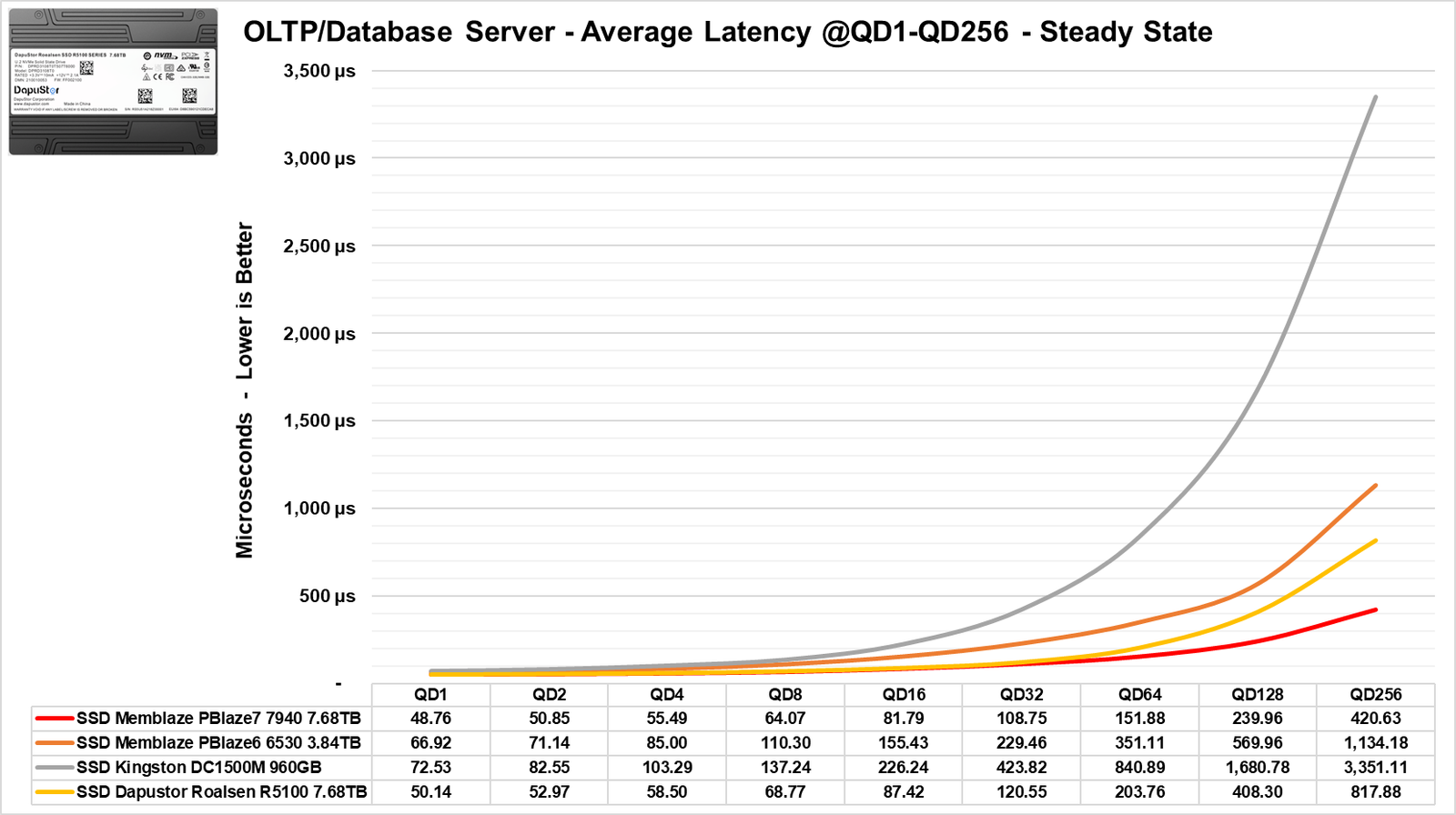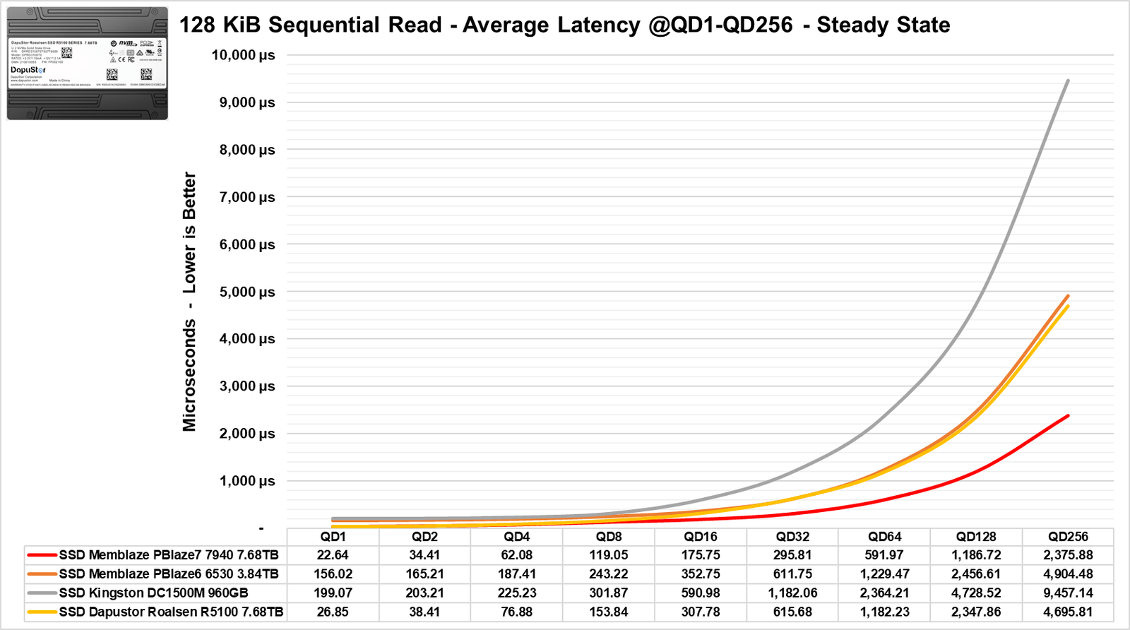 Regarding latencies, it is significantly lower than that of the Memblaze, with the Dapustor SSD being even close to the performance of a Gen5 SSD.