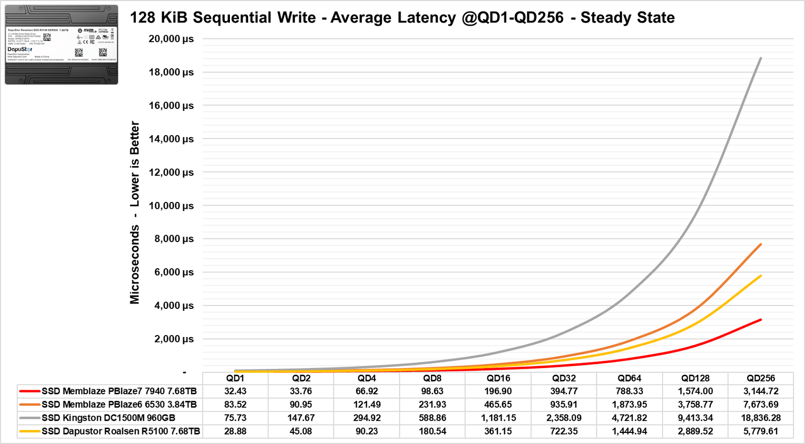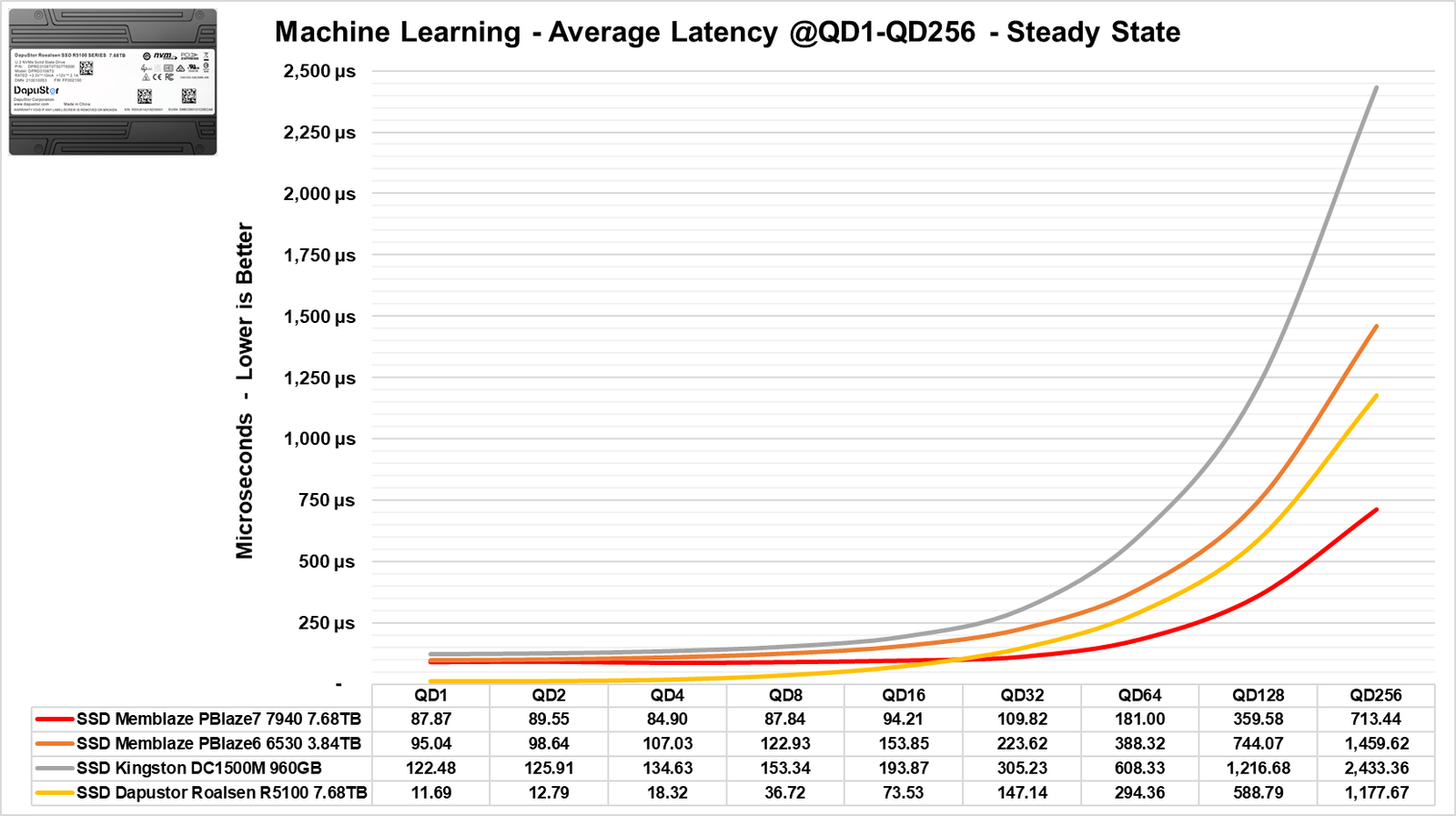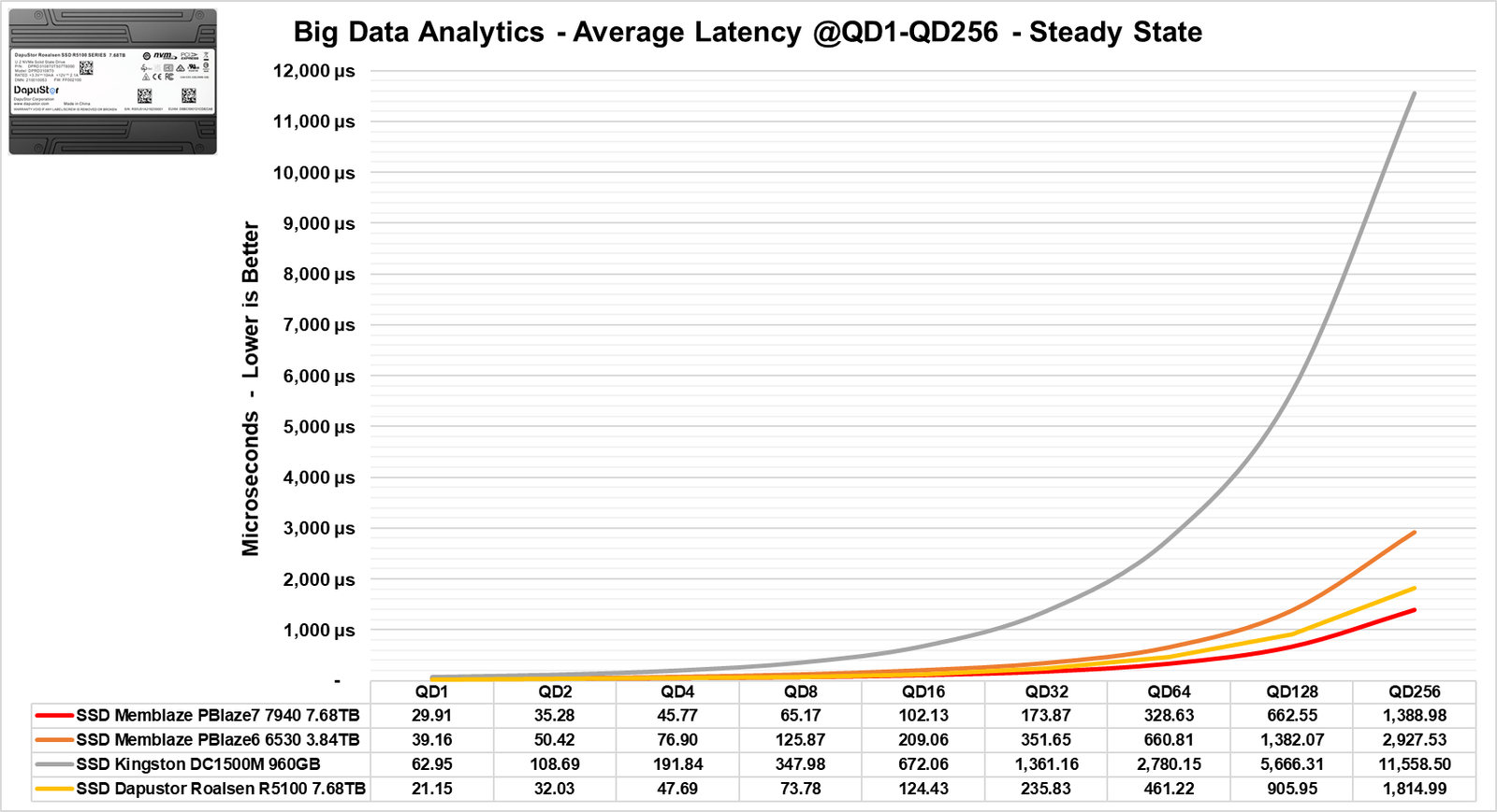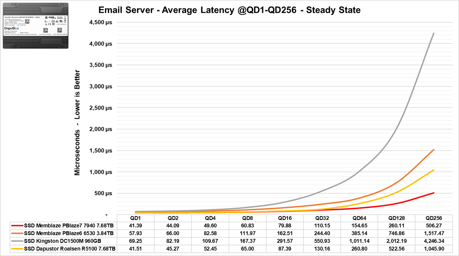 Regarding latencies, it is significantly lower than that of the Memblaze, with the Dapustor SSD being even close to the performance of a Gen5 SSD.