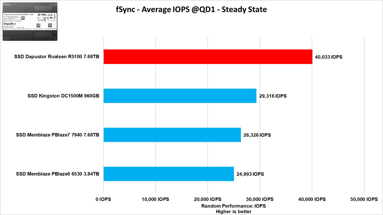 The fSync write performance evaluates a drive’s ability to ensure that data has been fully written to the disk with each operation. Critical applications, such as databases and high-availability systems, rely on the fsync() command to ensure data integrity by forcing the immediate writing of pending information.