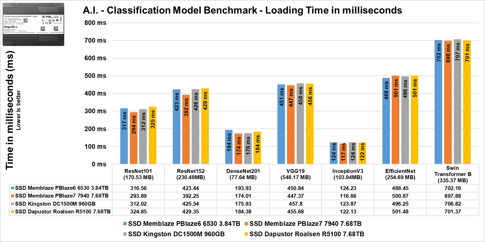 In these image classification models, we see that the difference between the SSDs is quite small due to the models being relatively small. Nowadays, there is a lot of talk about LLMs (Large Language Models), which are widely used in models like ChatGPT and Gemini, typically containing billions and billions of parameters. However, in tests like these, there might be a noticeable difference.
