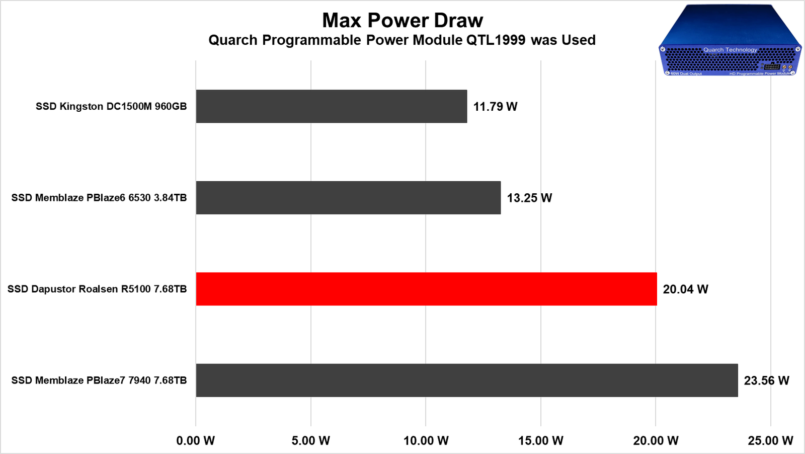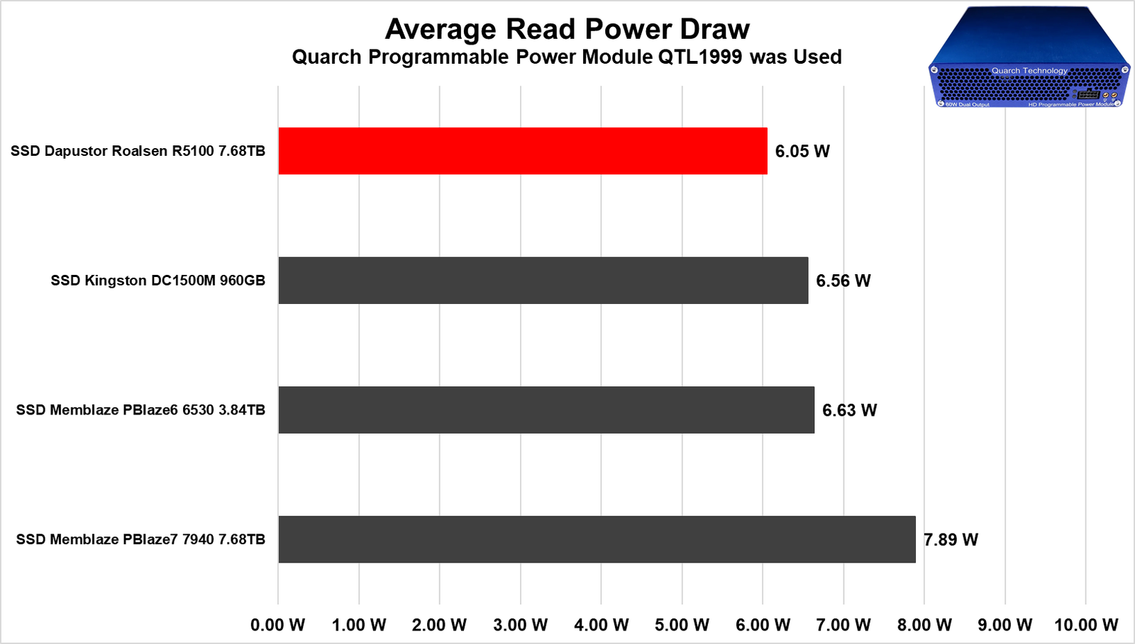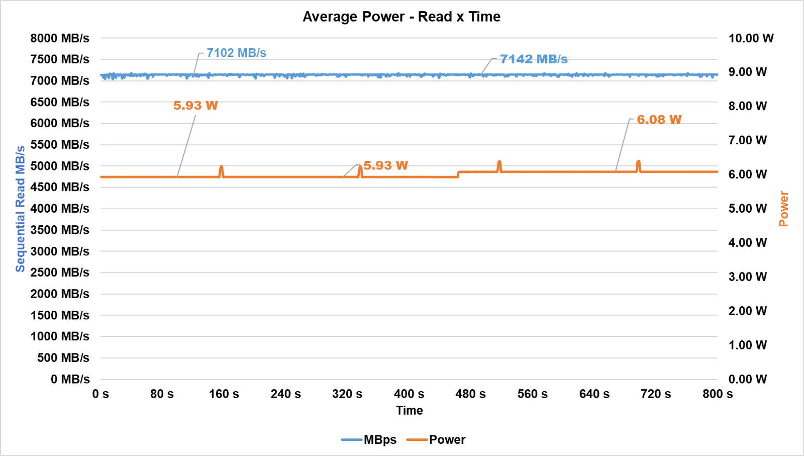 In the read test, it had a maximum consumption of 6.05W, making it more efficient than the other SSDs in the comparison, surpassing the Memblaze.