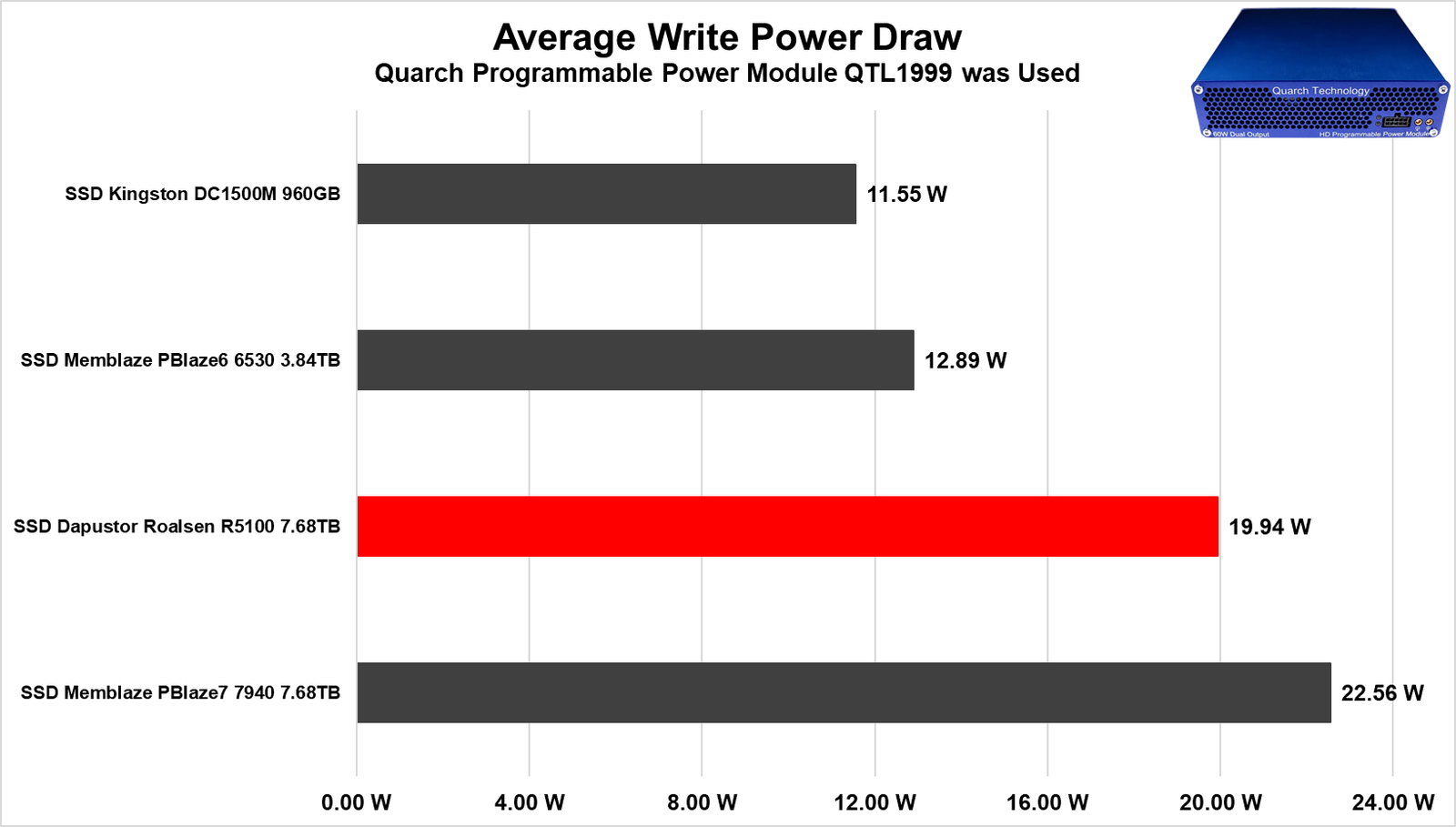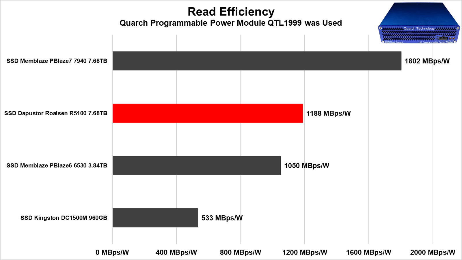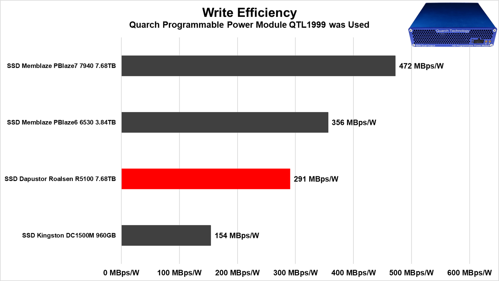 In terms of write efficiency, it is noticeable that it falls slightly behind the Memblaze 6530 we tested. This occurs because the power consumption of this drive was significantly higher than that of the Memblaze. While the Memblaze operated in the range of 11 to 13W, the DaPustor was in the range of 19 to 20W, which is a considerable amount. Even though its bandwidth was superior to that of the Memblaze, it was not enough to surpass it in overall efficiency.
