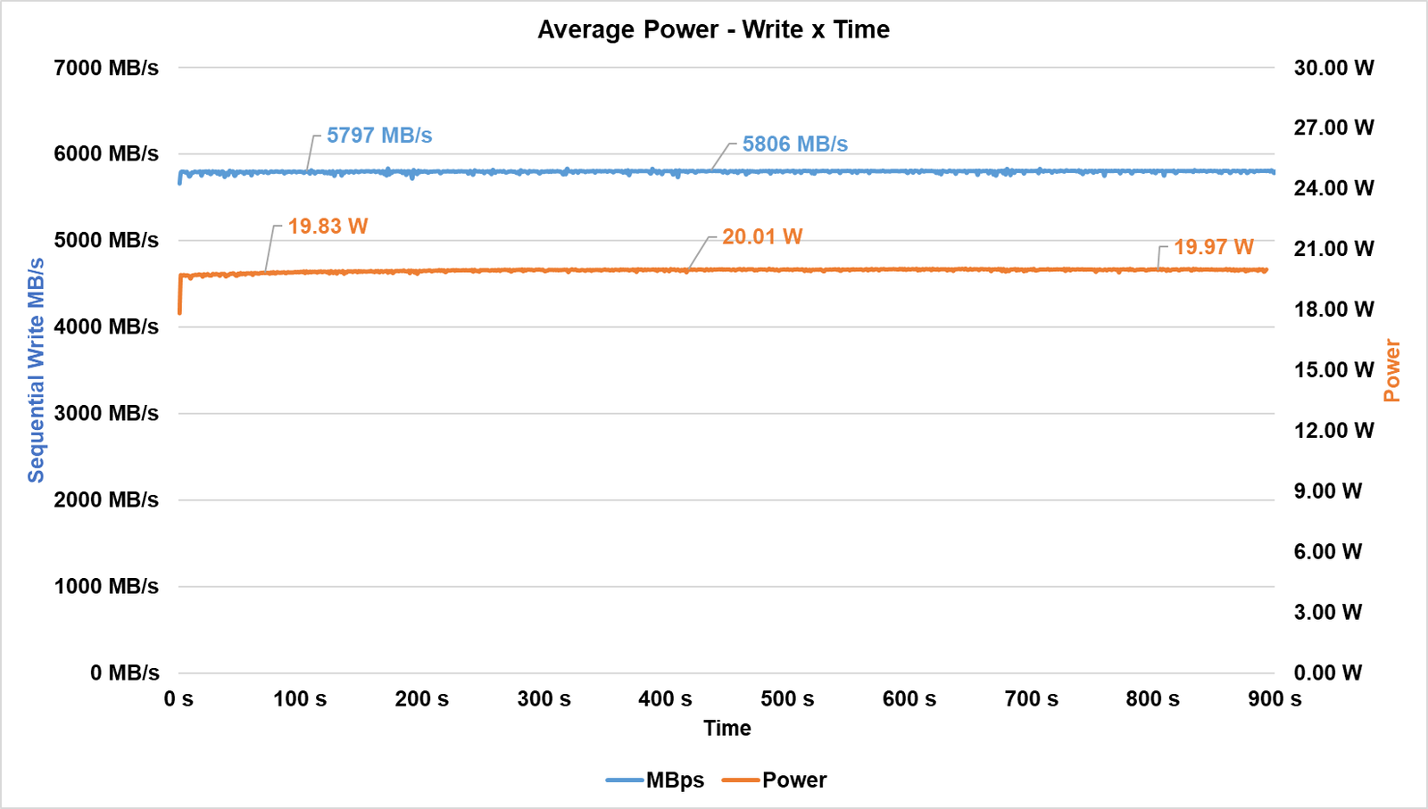 When we conducted our SSD filling test, starting with the write operation, we noted an average consumption of 19.94W during this benchmark. As we mentioned, this is a relatively high power consumption, but it can be attributed to its 16-channel controller and the number of dies in this SSD, as it has 128 dies in this project. Its bandwidth averaged around 5800 MB/s, slightly above the specification provided by the manufacturer.