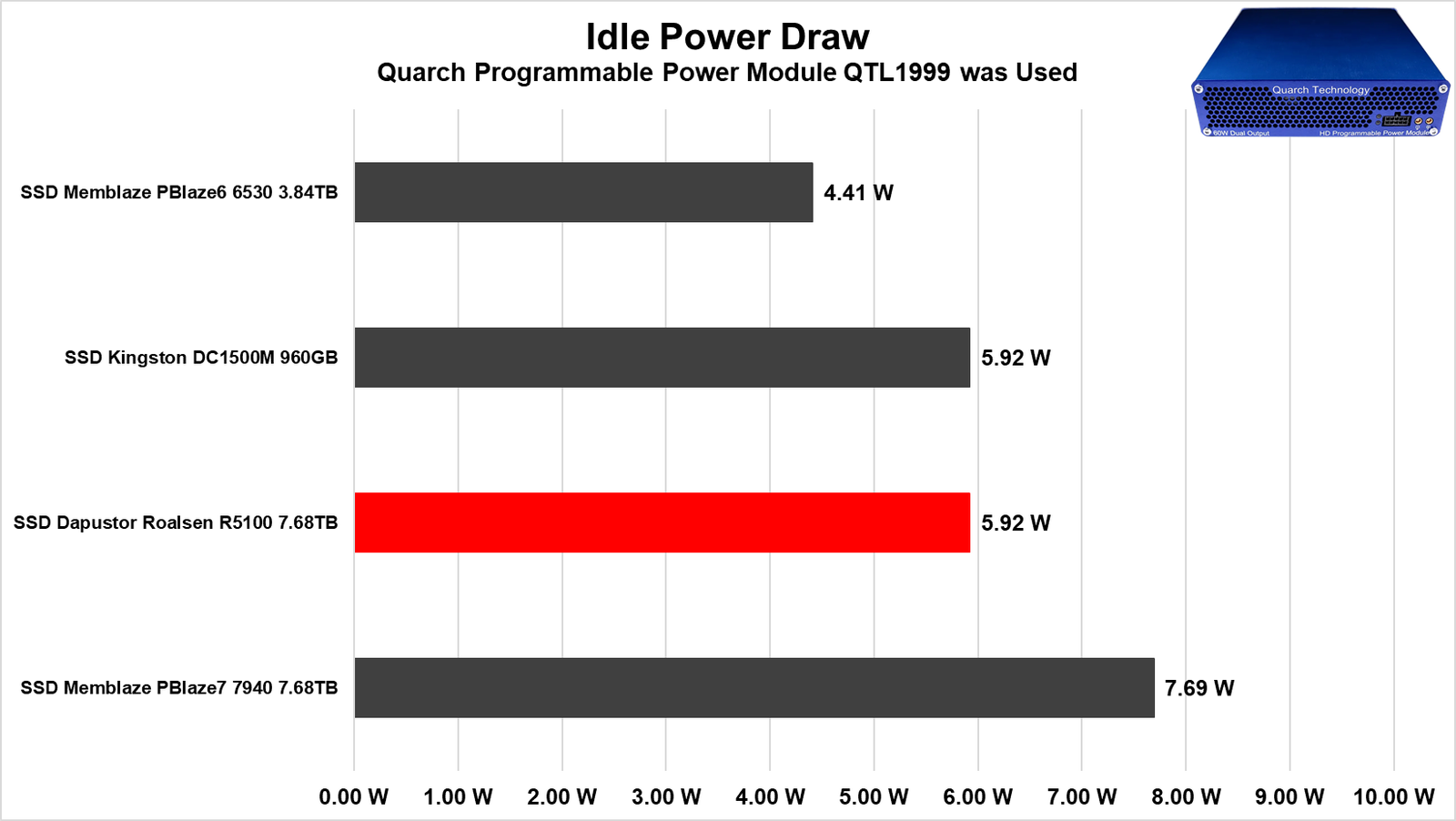 Lastly, and most importantly, we conducted the idle test, which is the scenario in which the vast majority of SSDs operate in everyday use. Although 5.92W is a “maximum” consumption that is quite high for an M.2 SSD, an enterprise datacenter SSD tends to have a significantly higher power consumption due to more robust controllers, many more NAND Flash dies, and DRAM Cache, as well as numerous capacitors and components for VRM and Power Loss Protection circuitry.