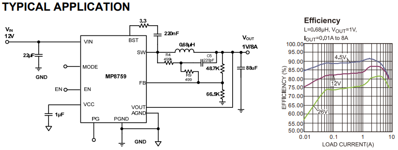 This component “AQQ” on the left is another from Monolithic Power Systems (MP8759), which is also a Step-down Converter but with support for much higher input currents, capable of operating with up to 8A.