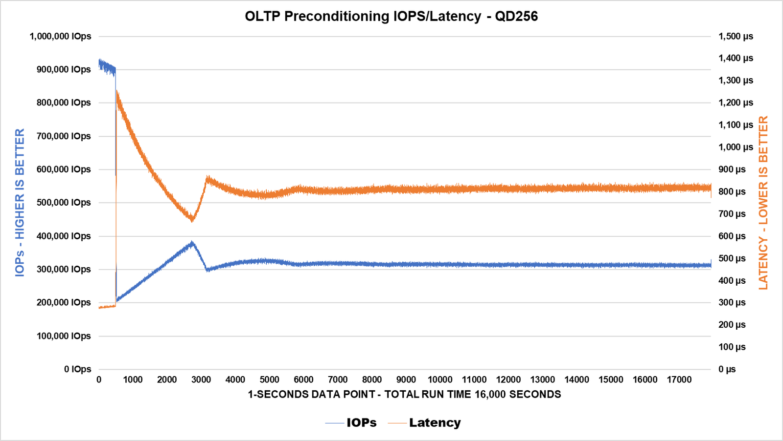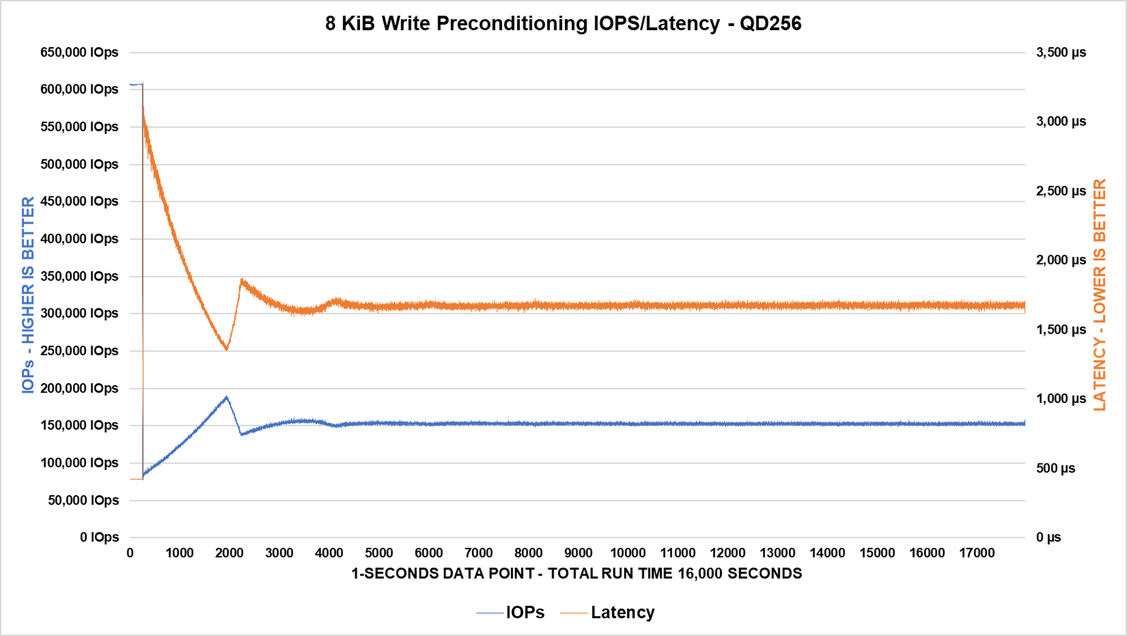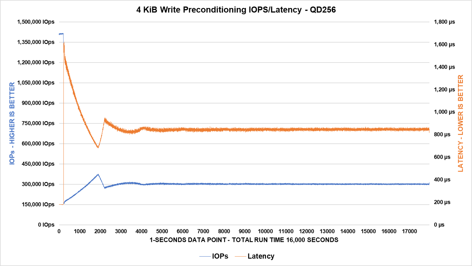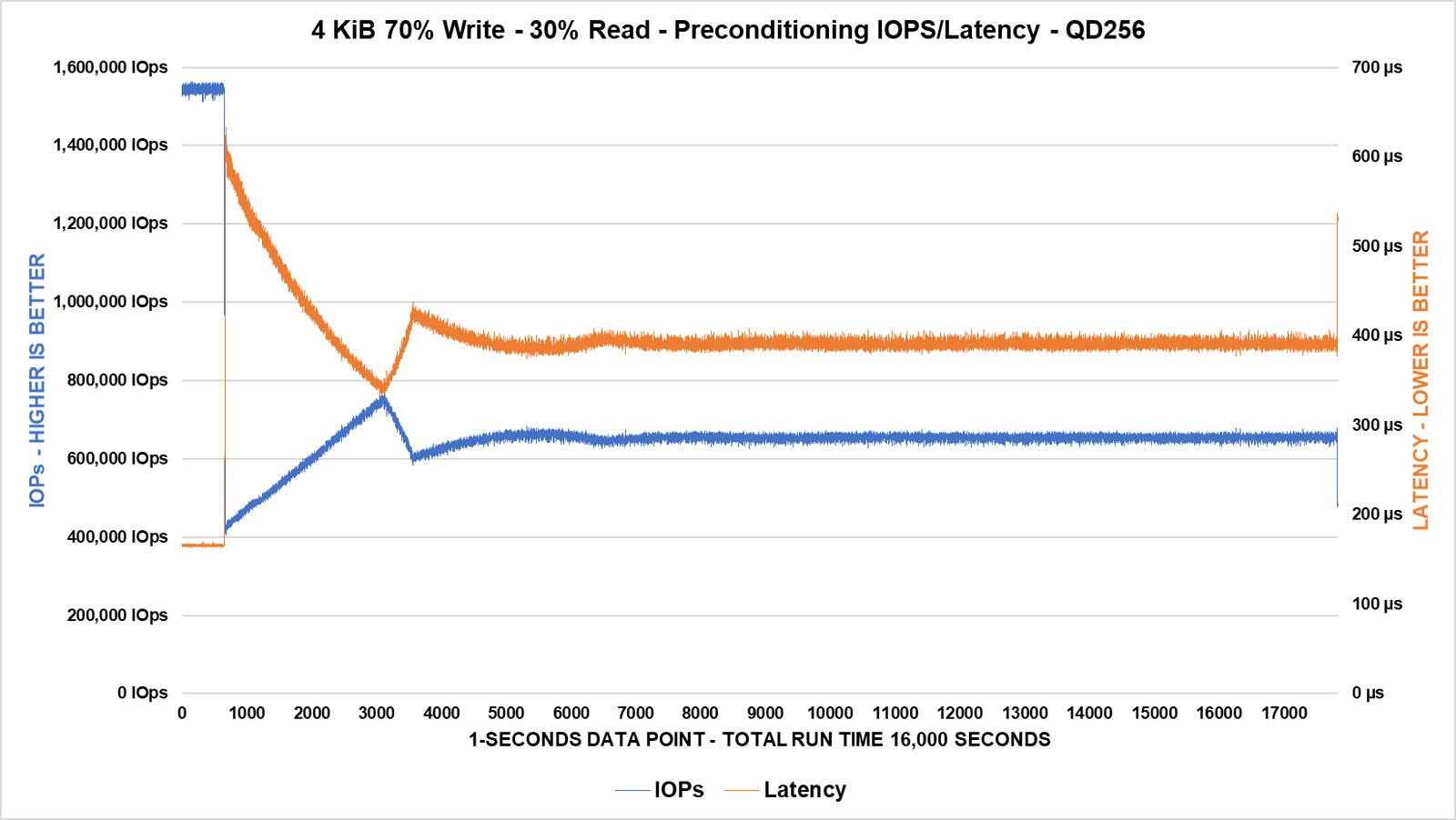 We can observe that the SSD starts strong with over 1.5 million IOPS, but shortly afterward, it drops and stabilizes until reaching Steady State at around 650K IOPS after 6000 seconds.