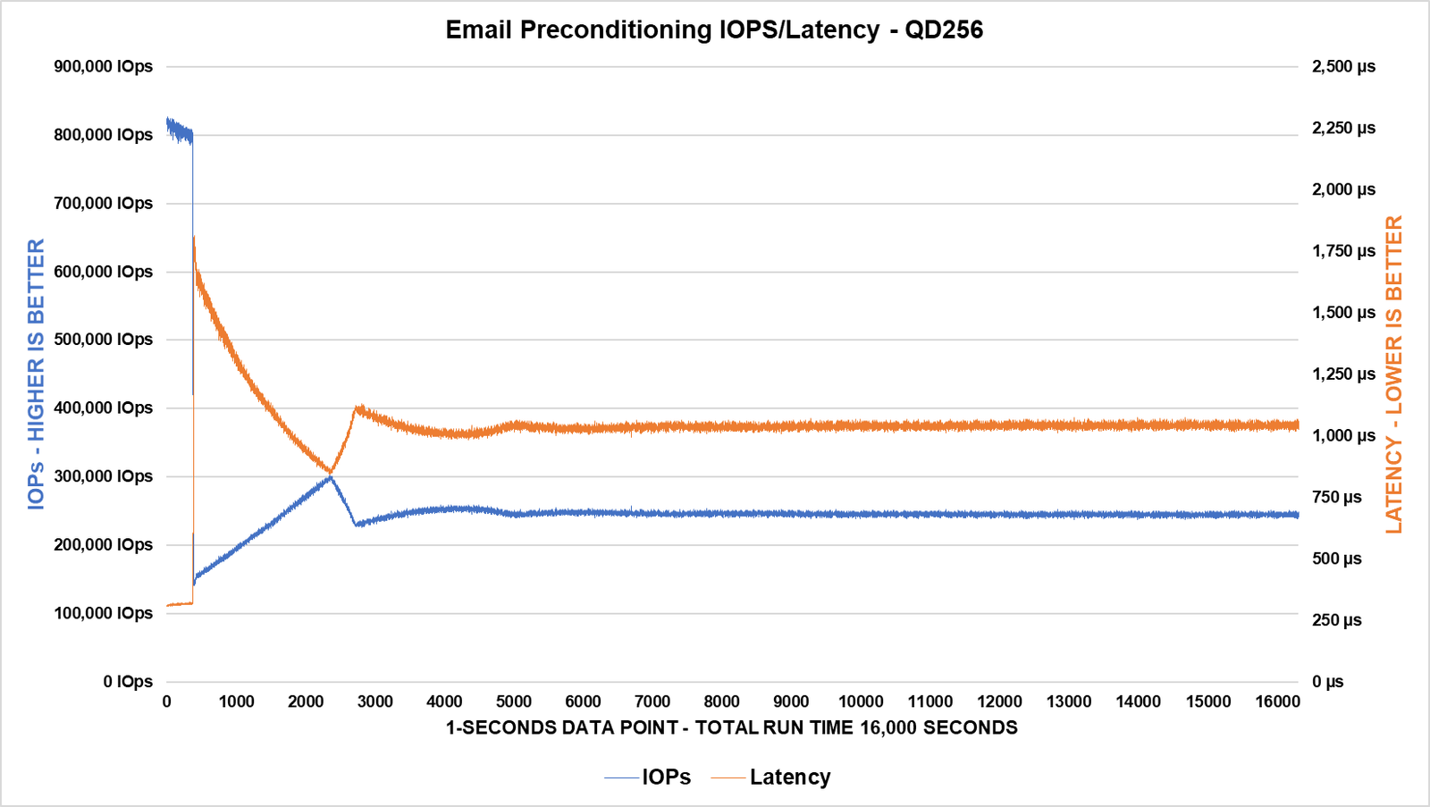 We can confirm that during this preparation, the SSD took approximately a little over 5,000 seconds to reach the Steady State, where it achieved a consistent performance in the range of 250K IOPS with latencies around 1100µs.