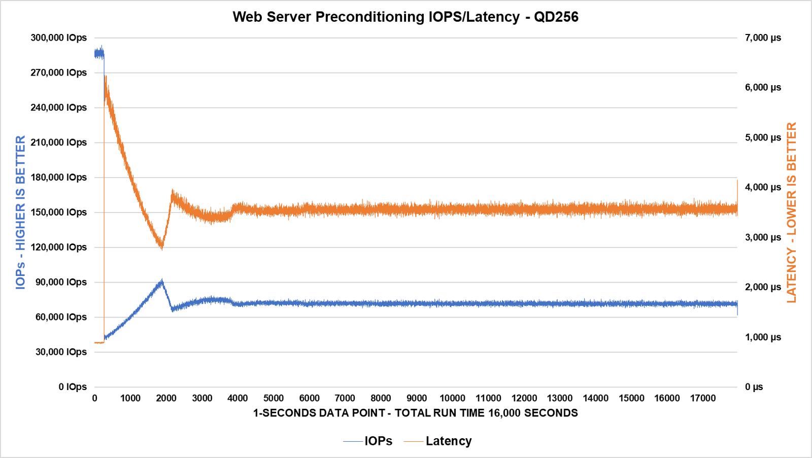 One of the most commonly used metrics in SSD benchmarks that represents multiple uses in numerous servers and datacenters. In this benchmark, we will run the test for over 16,000 seconds to observe how the SSD performs.