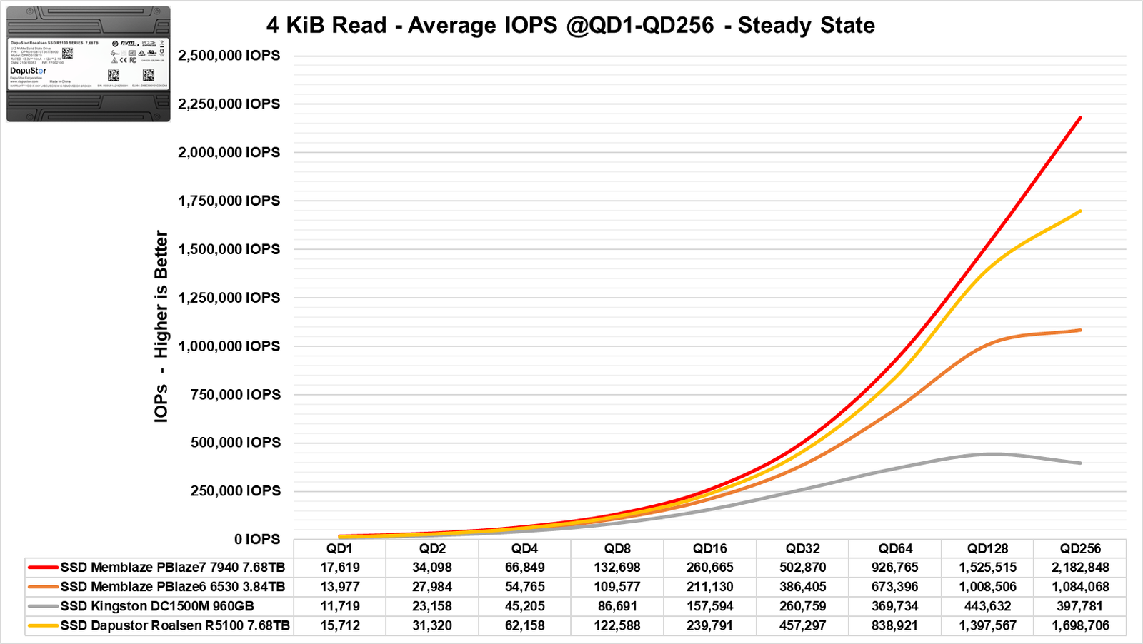 In its read performance, it reaches 1.70 million IOPS at QD256 or higher. Interestingly, at lower QD levels, it performs even close to the Gen5 SSD, significantly ahead of the Memblaze 6530, which is also a Gen4.