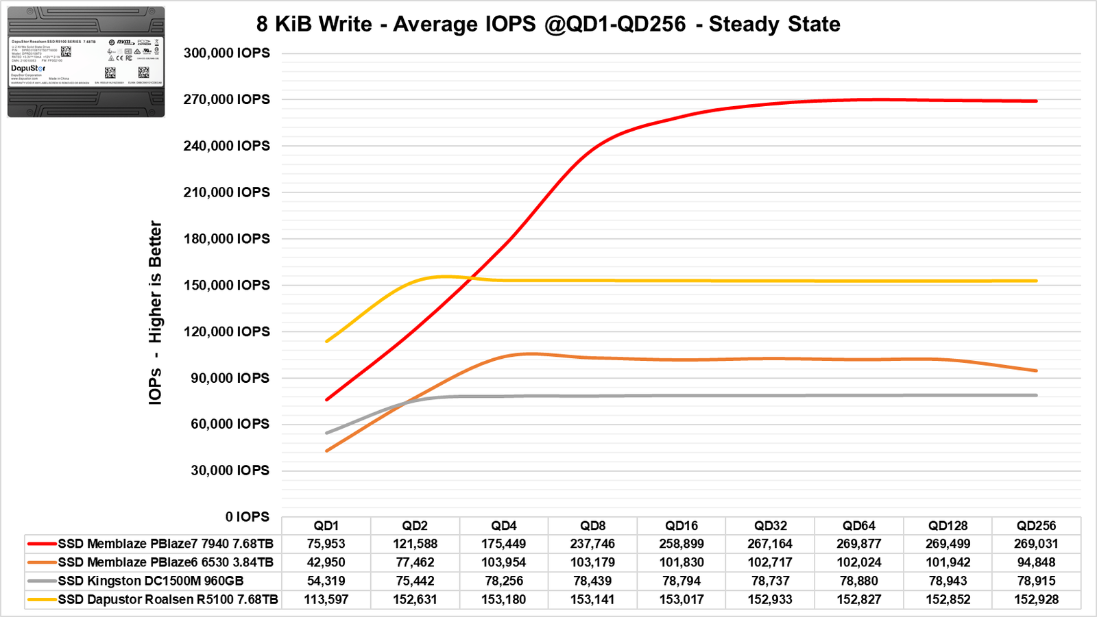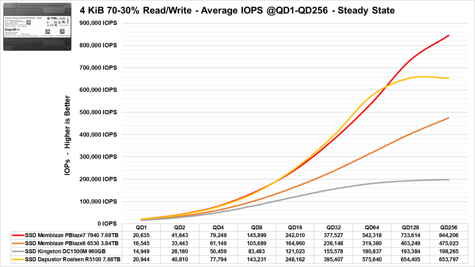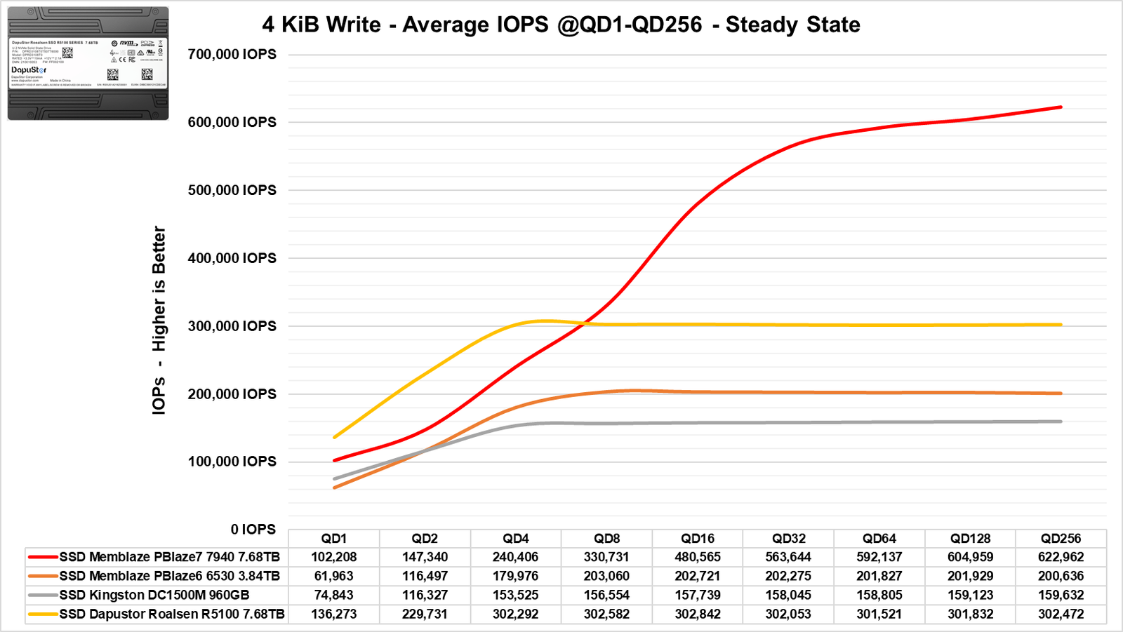 Initially, at lower QD levels, we see that these BiCS5 NANDs can provide incredible performance, even surpassing the Gen5 Memblaze 7940 SSD that we tested. Ultimately, it stabilizes around 300,000 IOPS, which is 100,000 IOPS ahead of the Memblaze Gen4.