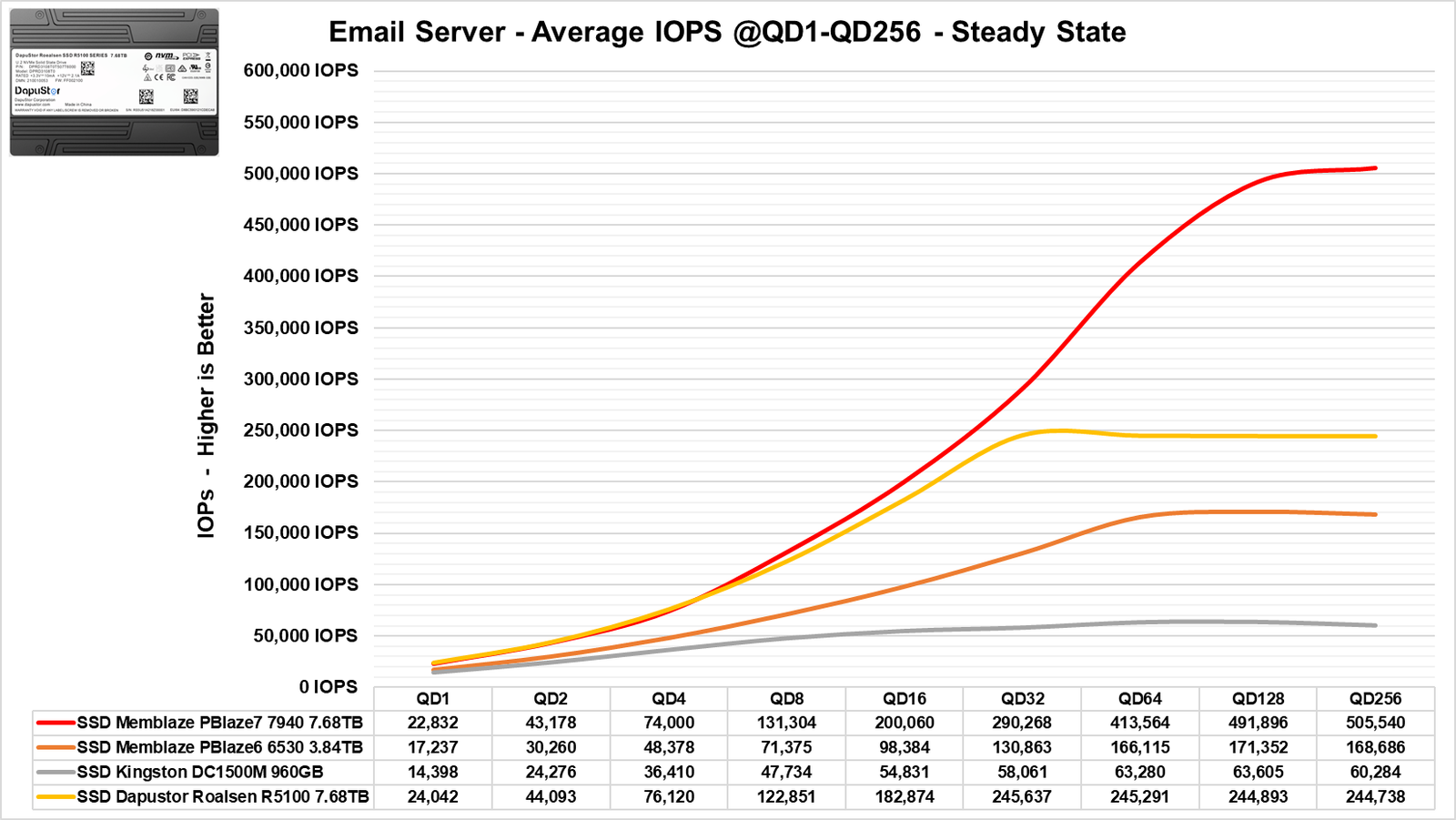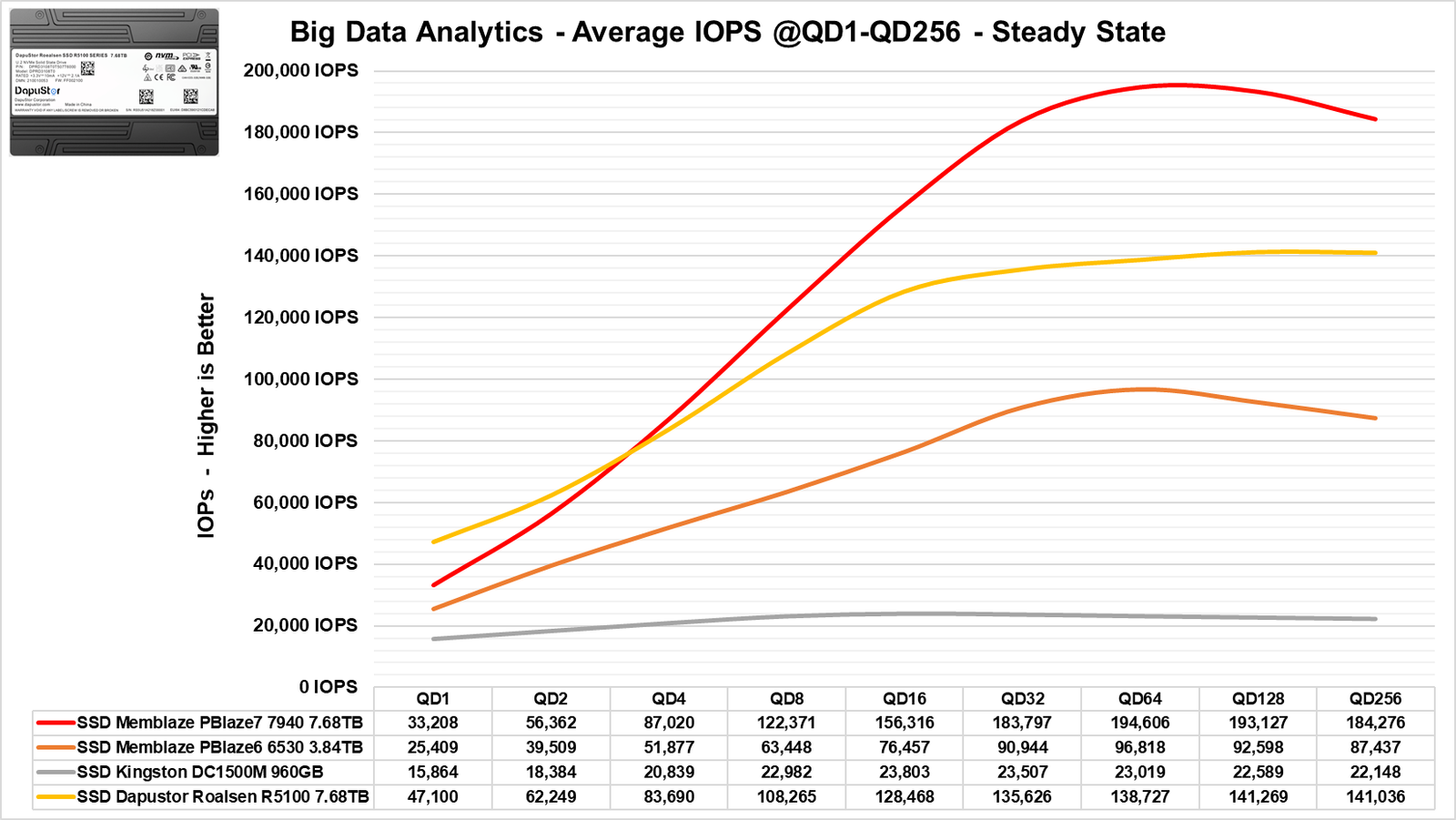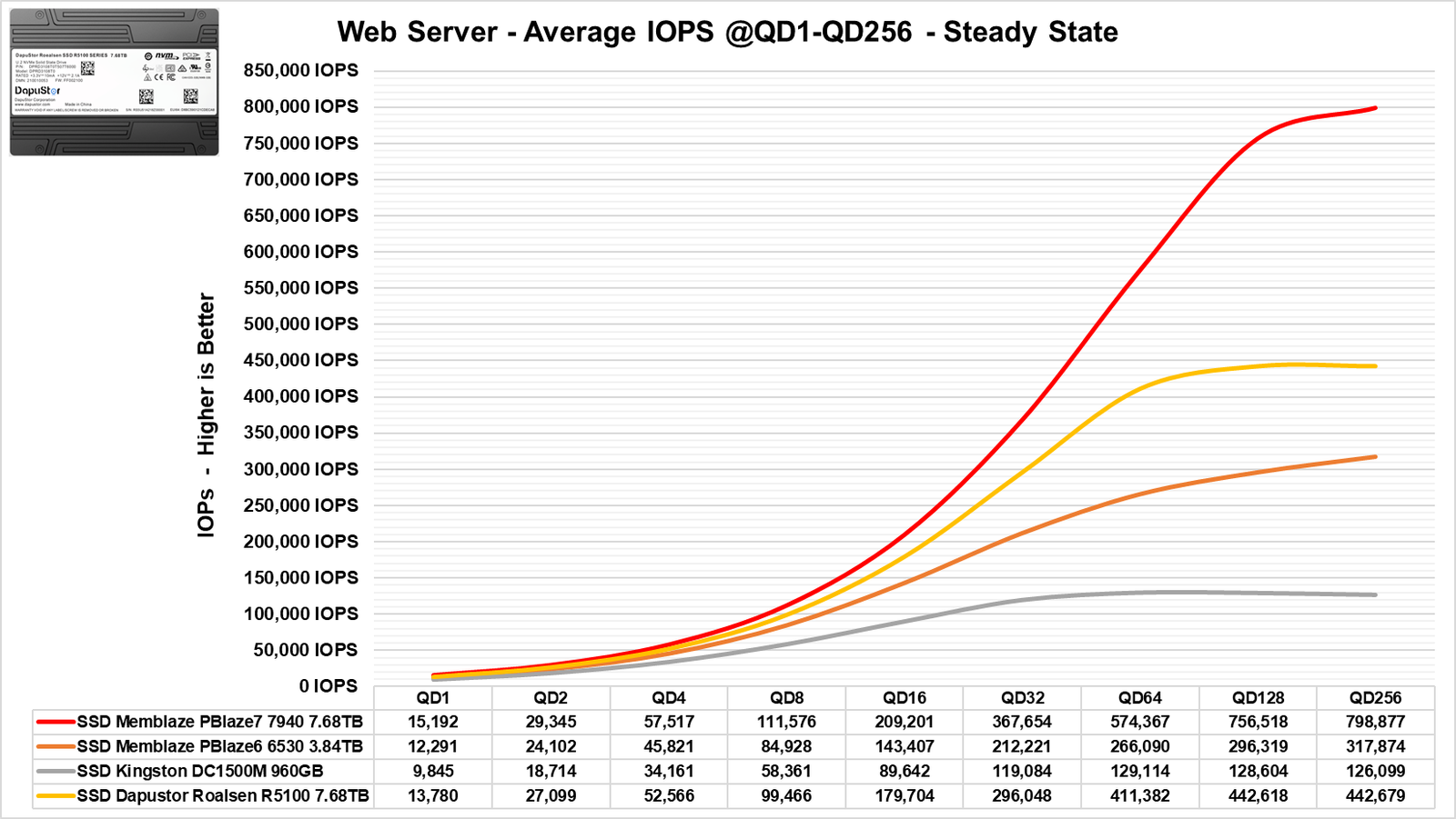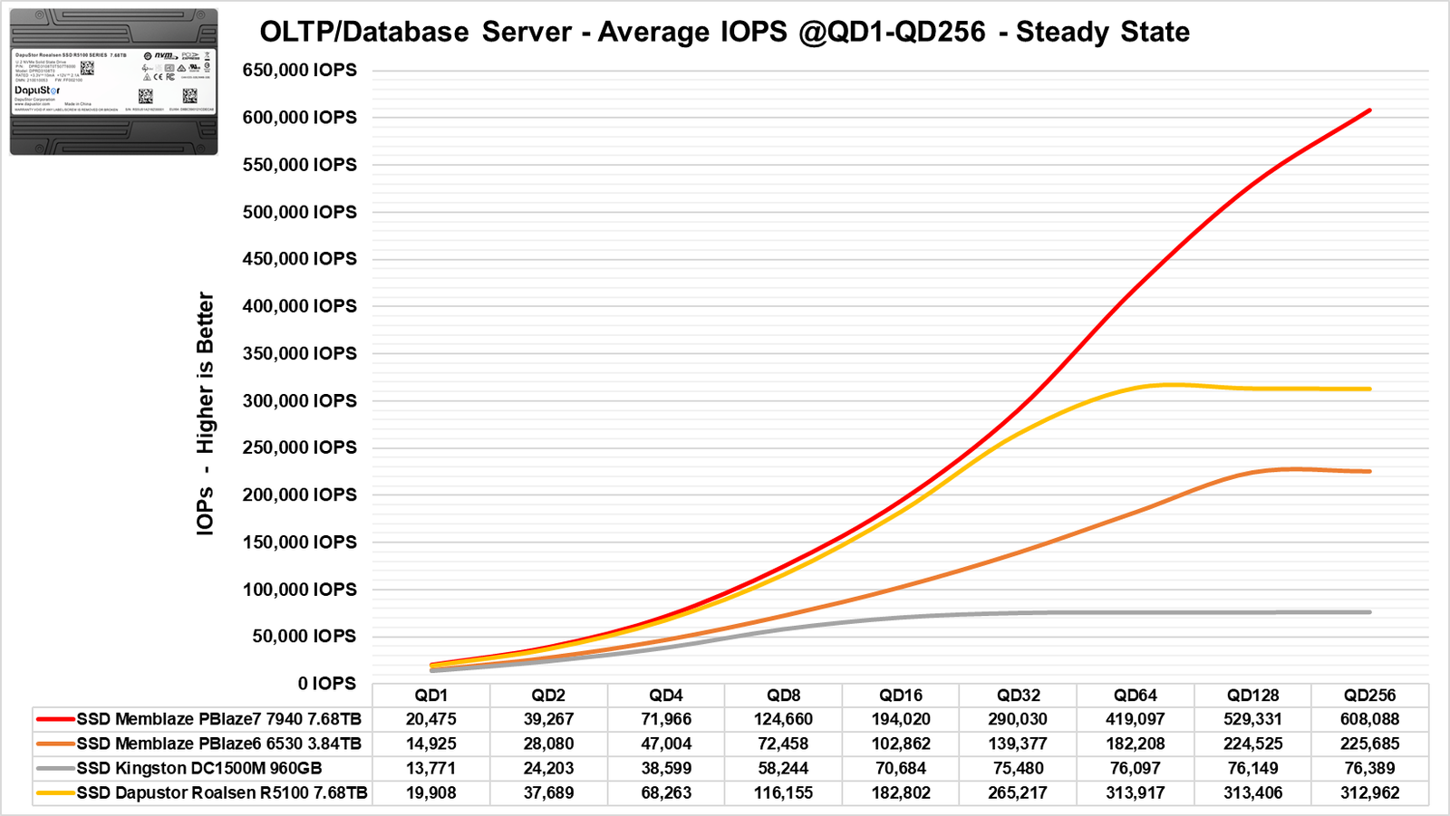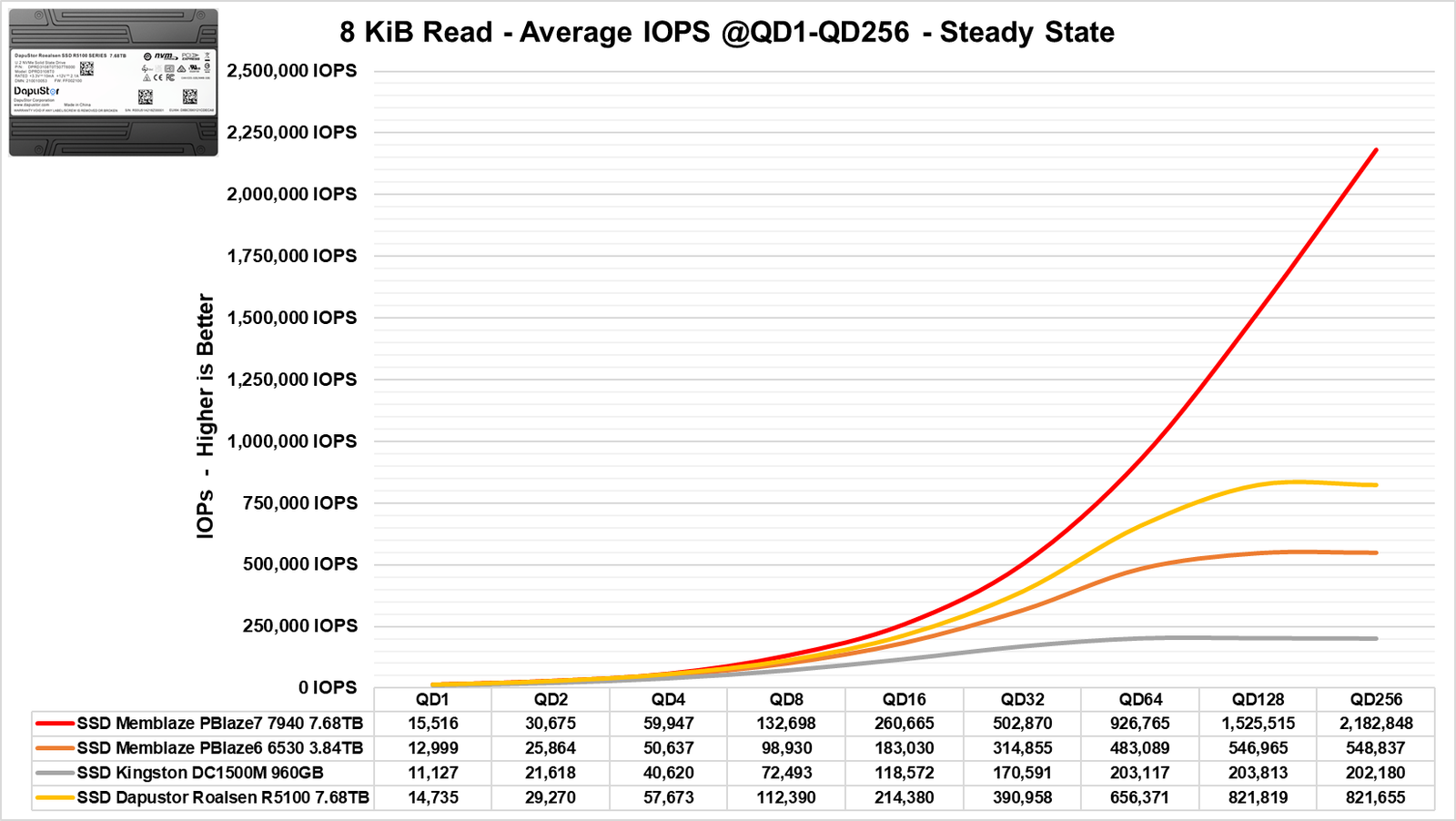 In this other benchmark, starting with its bandwidth, it leads among the other SSDs up to QD4. However, it is eventually surpassed only by the Memblaze Gen5, while the Memblaze Gen4 falls behind the DaPustor.