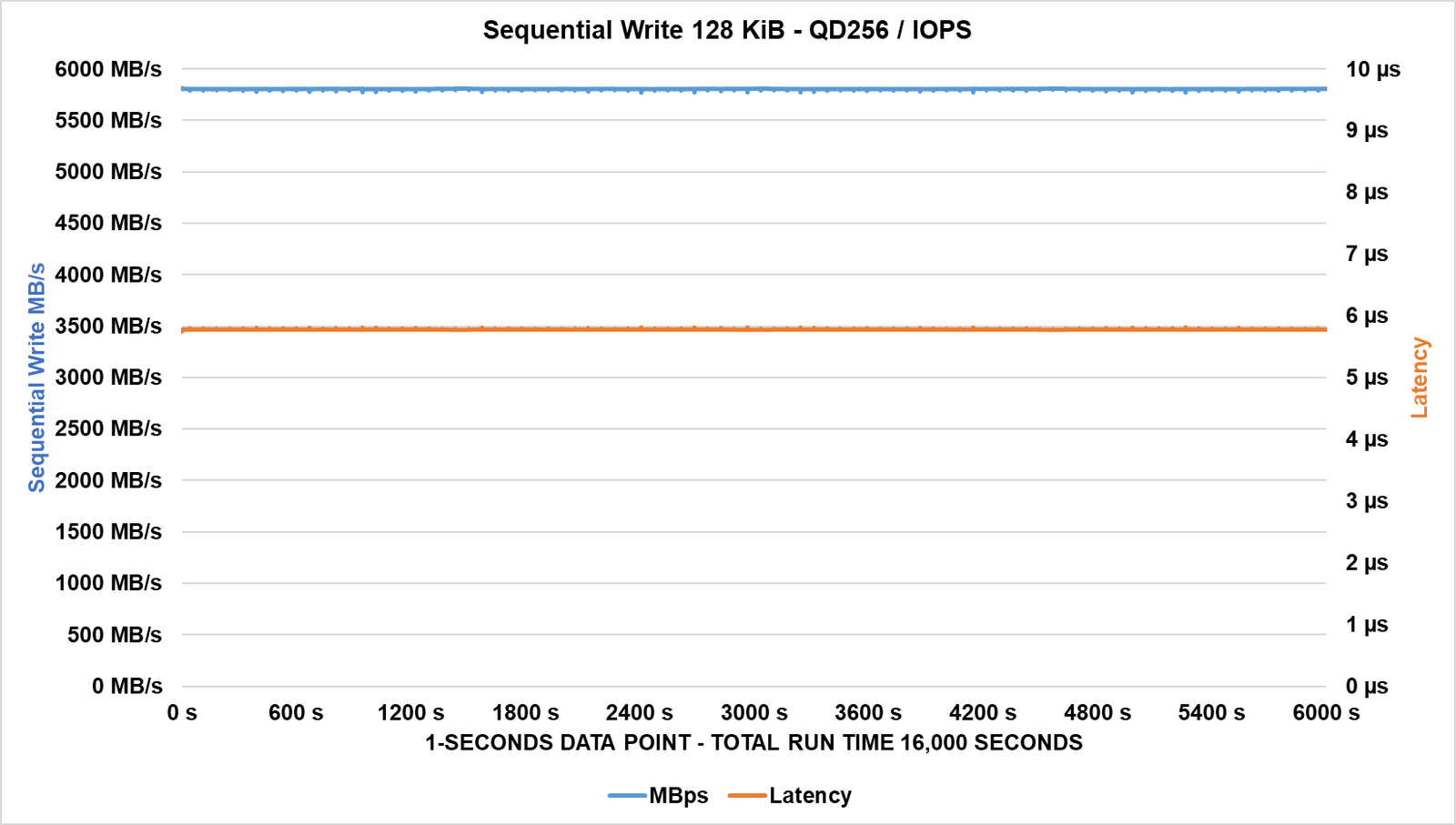 Starting with a sequential write test using 128 KiB blocks, we can see that throughout the test, its speed remains quite consistent. As mentioned, this type of SSD does not feature SLC Cache, and its latencies also showed good results even in this case.