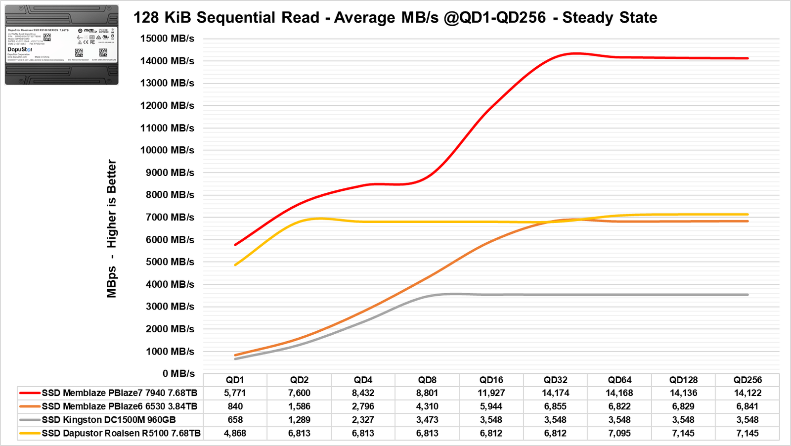 In its read performance, the same scenario is observed: while the Memblaze saturates the bus near QD32, this Dapustor SSD can saturate the bus at QD2.