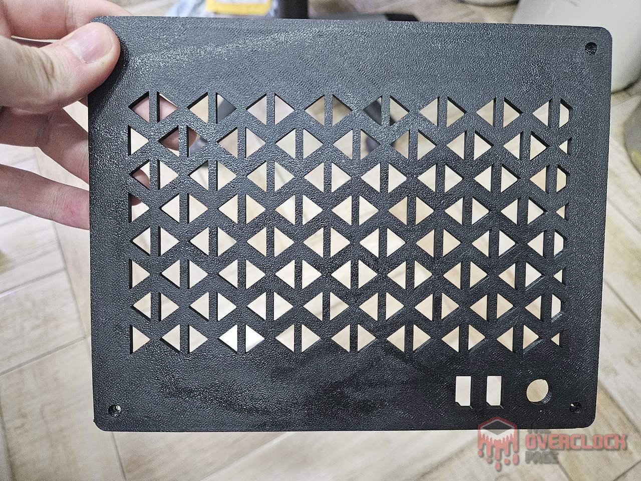 That said, to cover the fan holes, I modeled a part following the same front panel design. These pieces were printed in black ABS plastic and screwed onto the sides of the case.