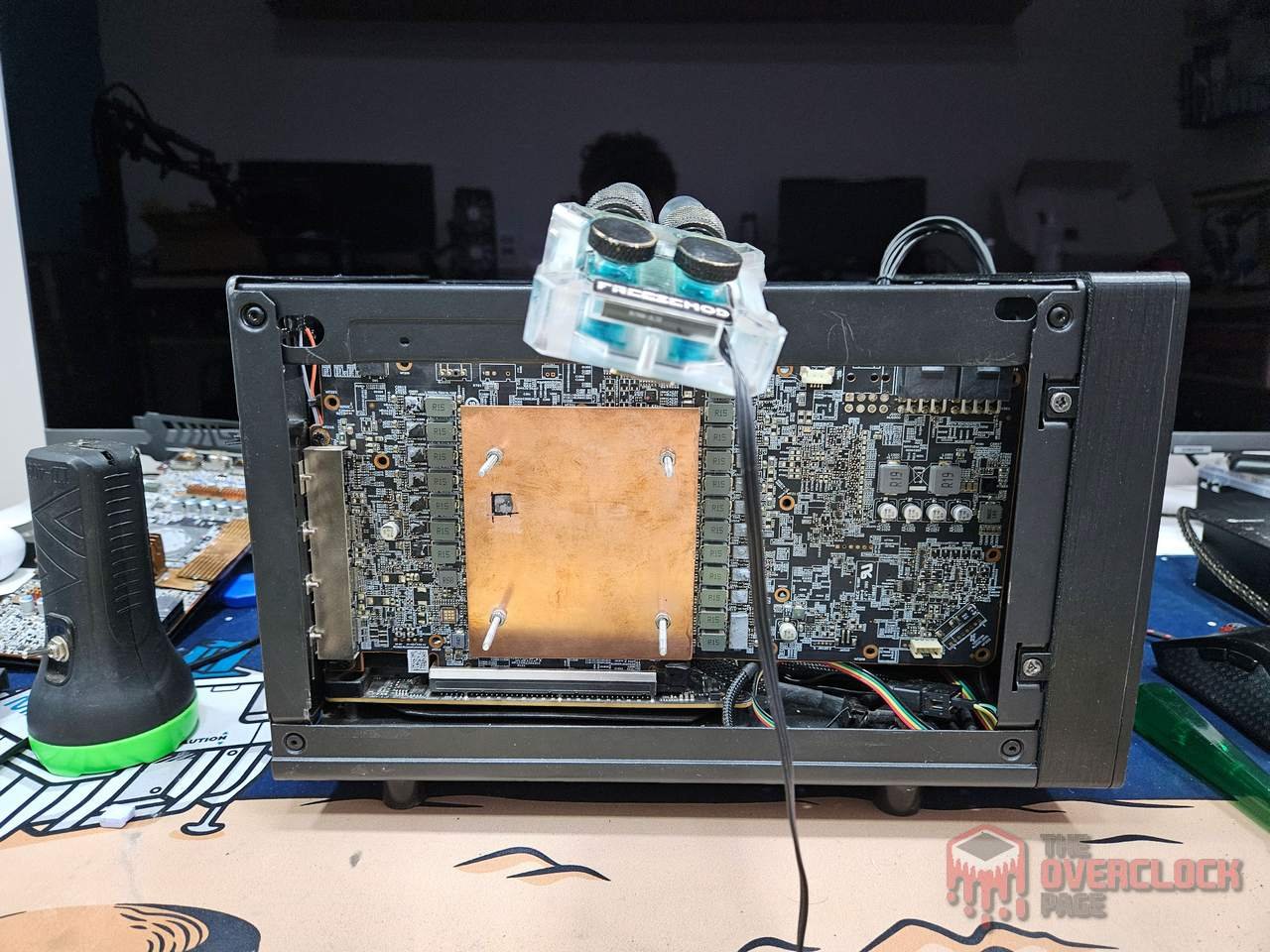 Unlike EVGA, which opted for a protrusion on the base of the block to allow direct contact with the GPU, here a 1.5mm copper plate was used to make contact both with the GPU’s die and memory chips, with the block handling heat dissipation through it.