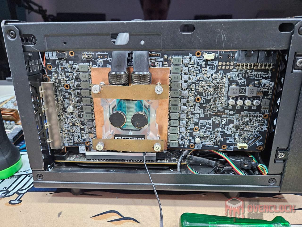 The “supports” for the block were repurposed from the reference test of the RX 6800 XT, hence the crappy appearance, but functional enough! 🙂