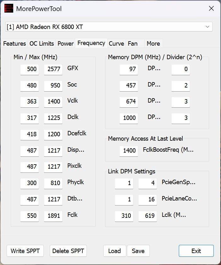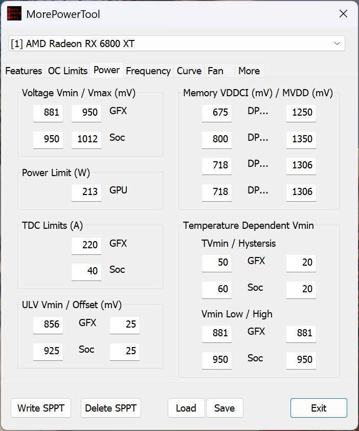 For the RX 6800 XT, undervolting was done using MPT, reducing the GPU’s standard voltage to just 950mV, SOC to 1012mV, and memory to 1306mV. Despite these reductions, it still achieved 2300 MHz in games, with performance virtually identical to the stock card, but consuming less than 200W under load!