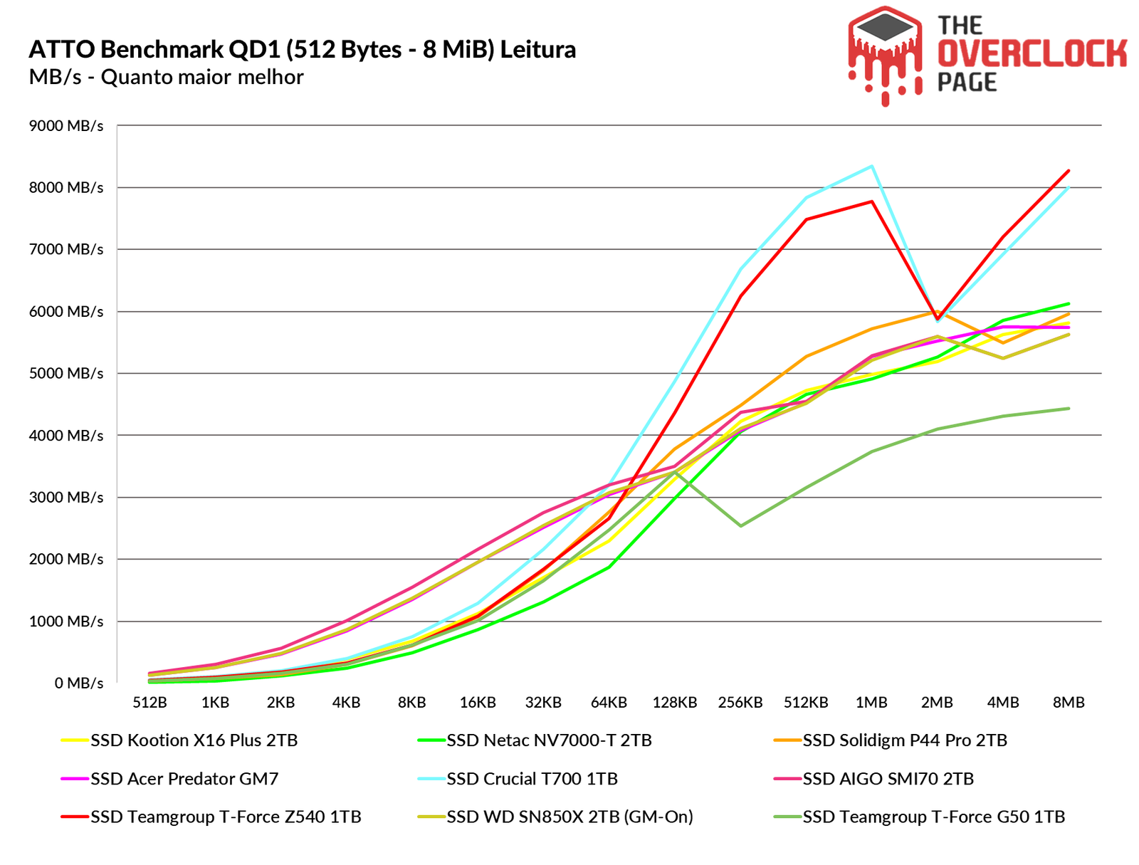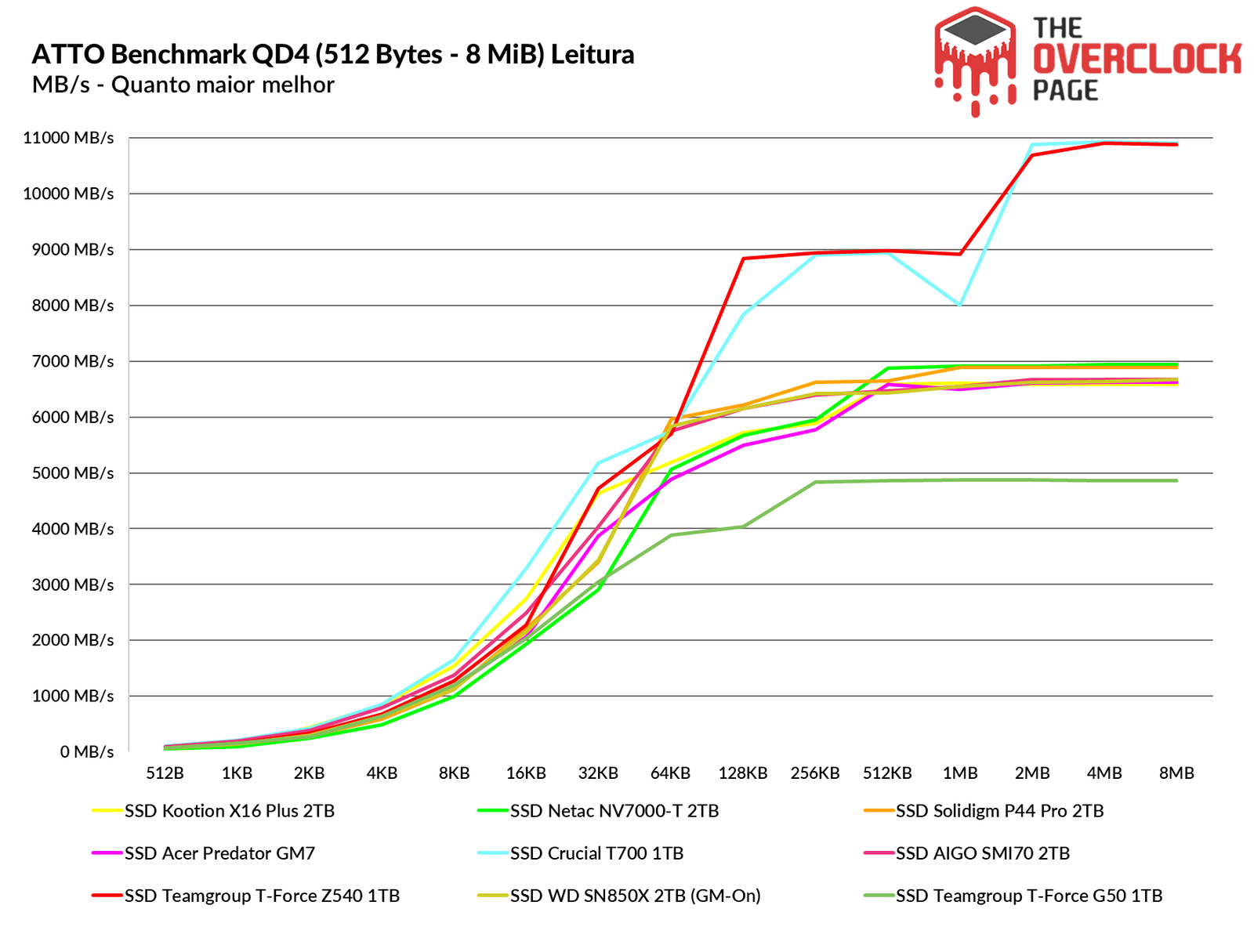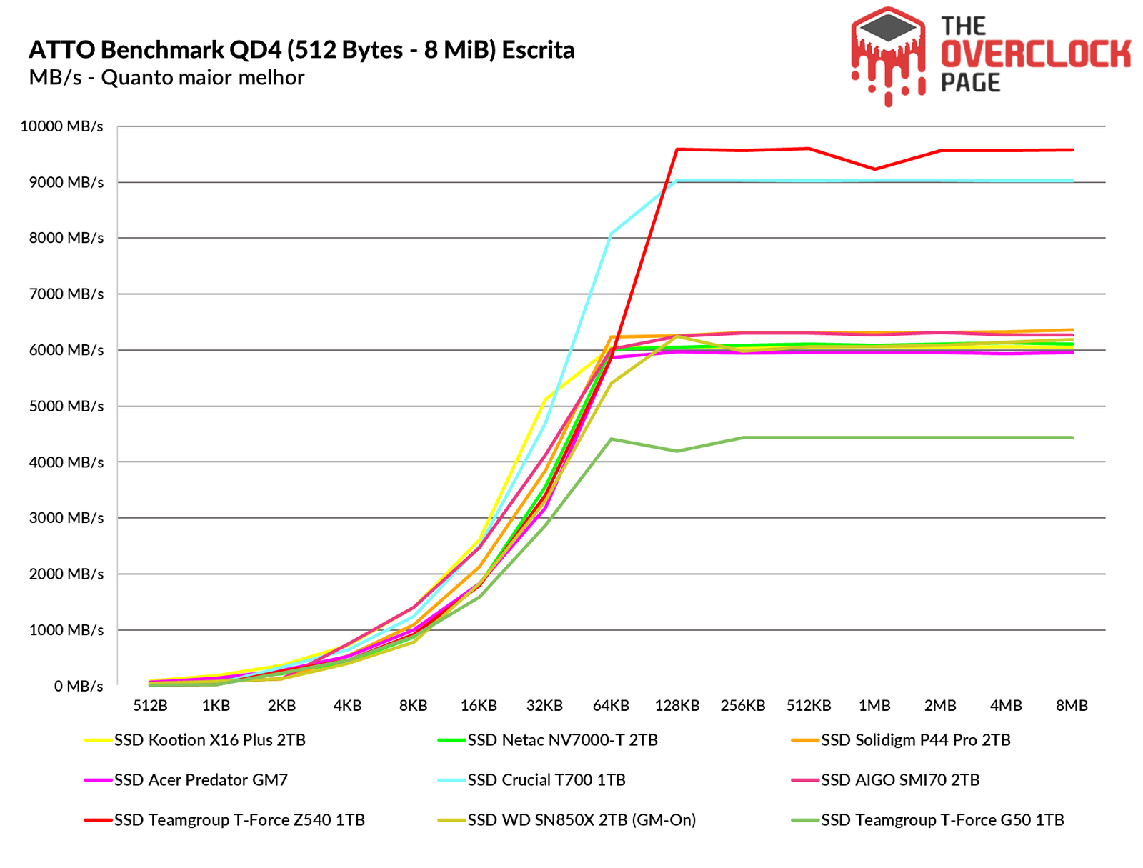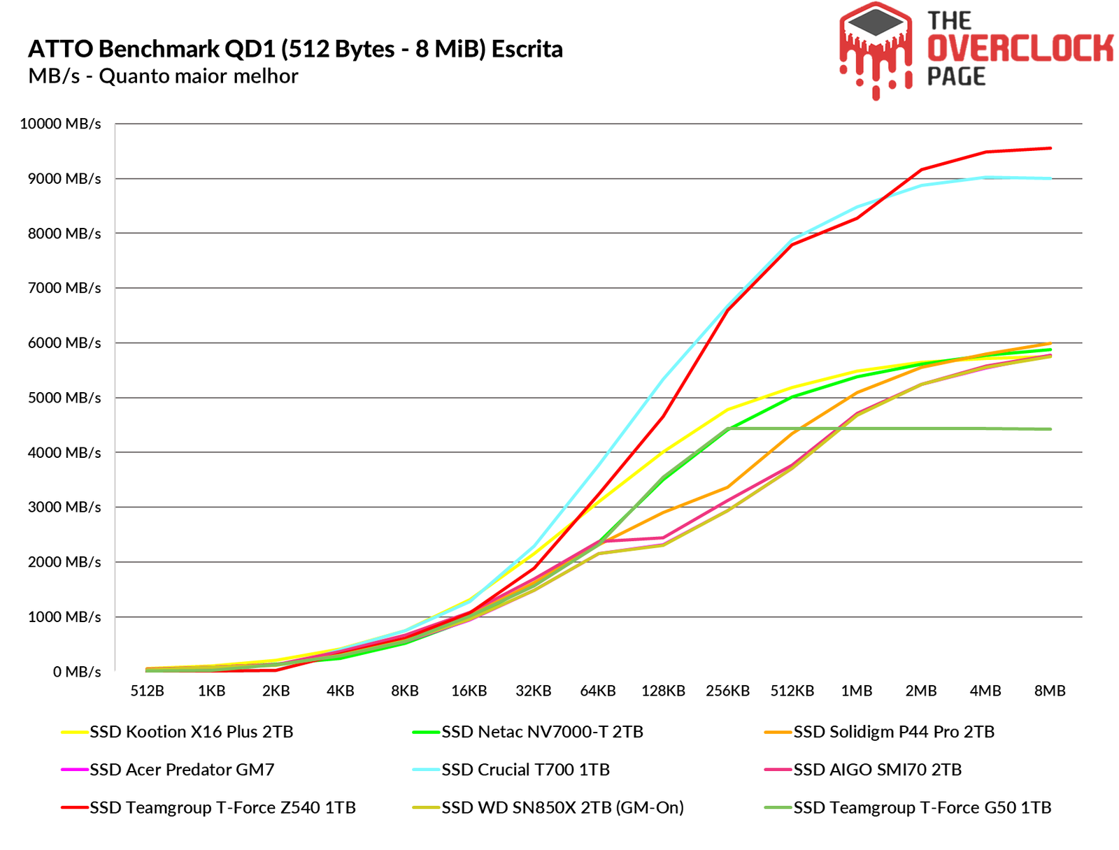 O ATTO Disk Benchmark é um software que faz um teste de velocidade sequencial com arquivos comprimidos, ou seja, para uma simulação em uma carga de transferência de dados como no Windows, geralmente temos algo em torno dos blocos de 128KB à 1 MiB, ambos os SSDs Gen5 tiveram resultados similares, apenas o Z540 que no início do benchmark ficou bem atrás do T700 mas logo em seguida ele consegue alcançá-lo.