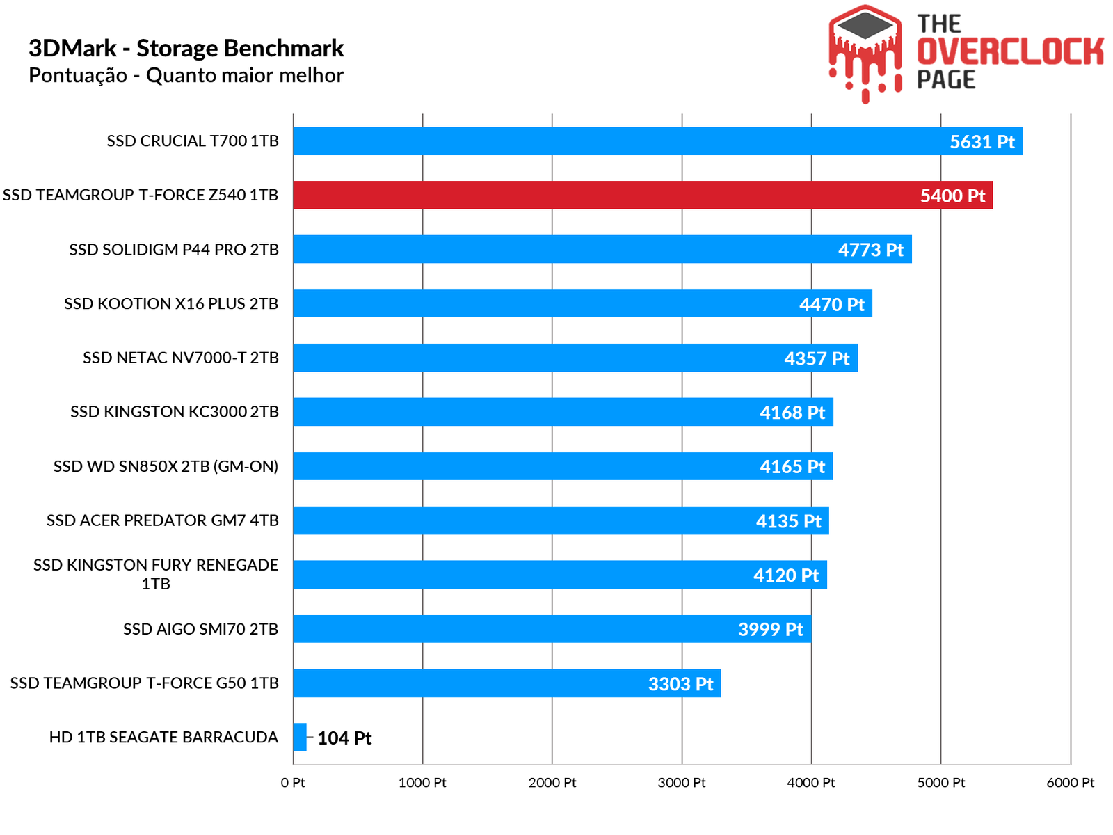 Já neste benchmark, que também possui algumas traces realísticas, mas com foco maior em produtividade, o mesmo comportamento é notado, onde devido sua alta largura de banda em relação aos SSDs Gen4, colocam o Z540 na frente do comparativo.