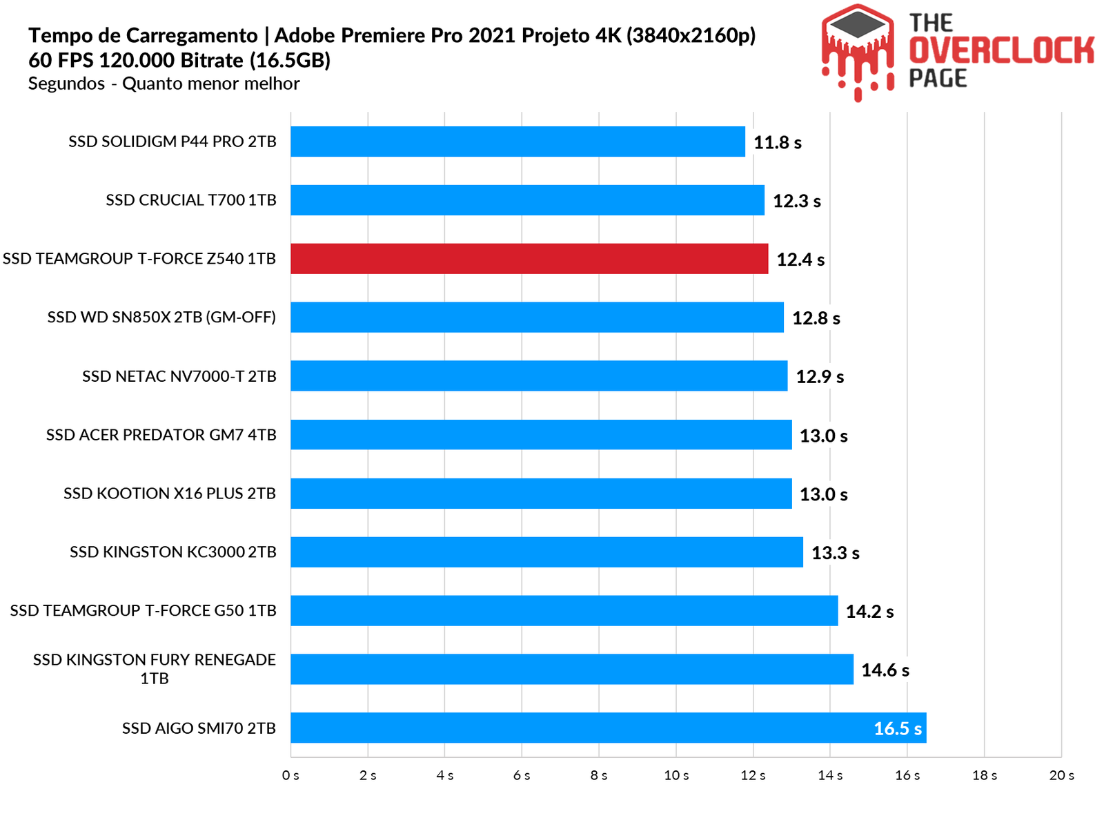 Ao utilizarmos o Premiere para carregarmos um projeto de mais de 16GB, houve outro empate técnico entre estes 2 SSDs Gen5, ambos com resultados muito bons.