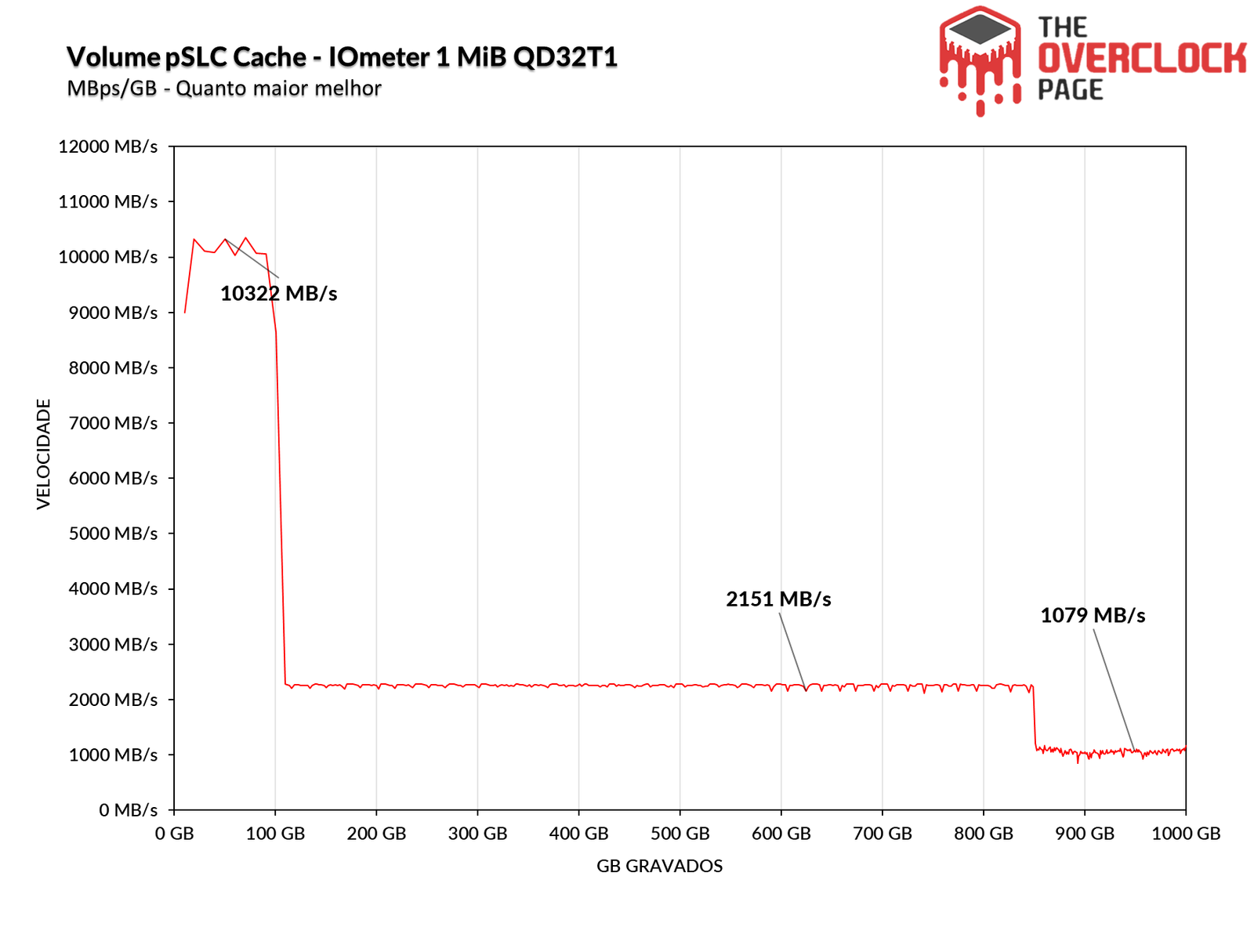 Através do IOmeter, podemos ter uma ideia do volume de SLC cache deste SSD, já que o fabricante muita vezes não informa este valor. Pelos testes que realizamos, foi possível constatar que ele possui um volume de pSLC Cache dinâmico, de cerca de 109GB, onde ele conseguiu manter velocidade média de ~ 9930MB/s até o fim do buffer.