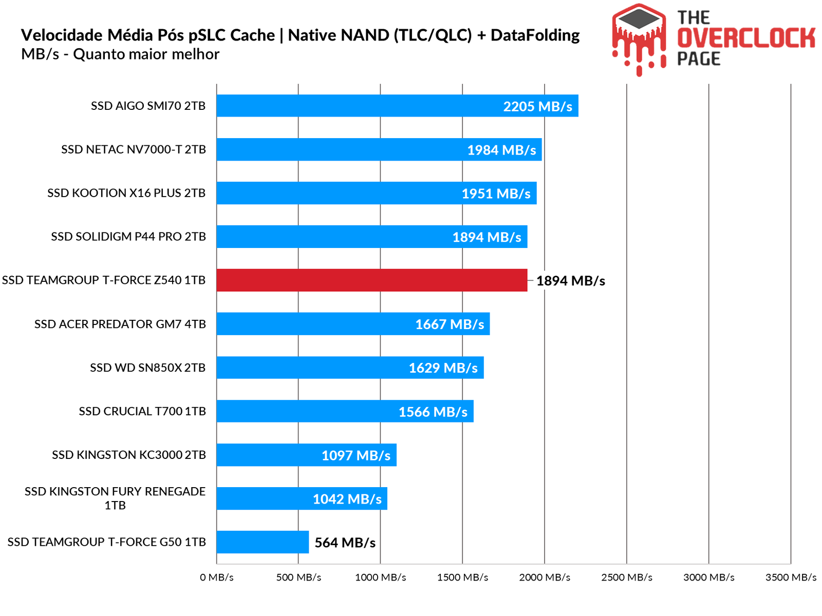 Sua velocidade média geral contanto a região Nativa e a de Folding é de cerca de 1894 MB/s e como vemos no gráfico abaixo, é extremamente alto, ultrapassando até mesmo o Crucial T700 que testamos.