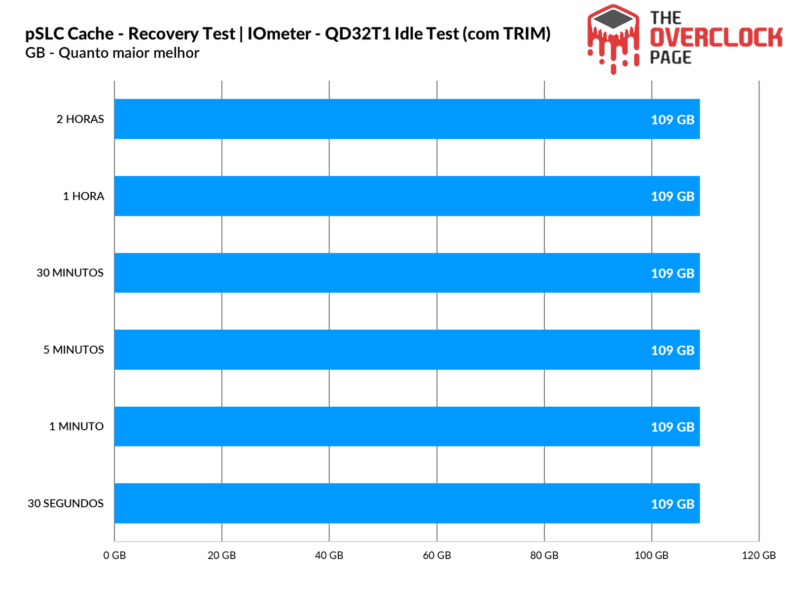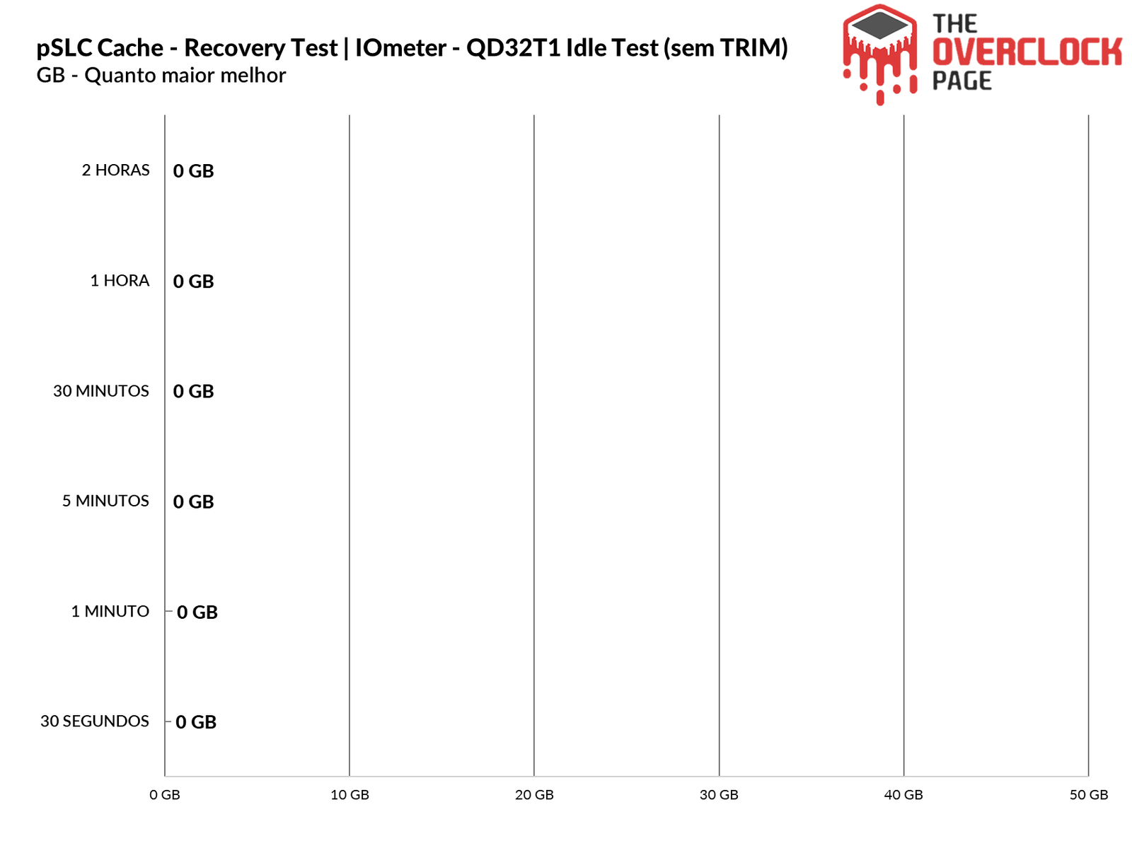 Realizamos também um teste para ver quanto tempo o SSD levaria para recuperar parte de seu Buffer e no decorrer da nossa bateria de testes, que dura de 30 segundos até 2 horas em idle, utilizando o TRIM e gargabe collection vs TRIM/GC não utilizados. Ao testarmos sem usar o TRIM/GC, podemos observar que como já era de se esperar de controladores Phison, ele não recuperou nada se não utilizarmos o TRIM.