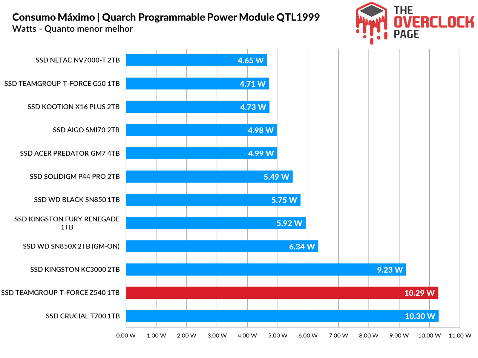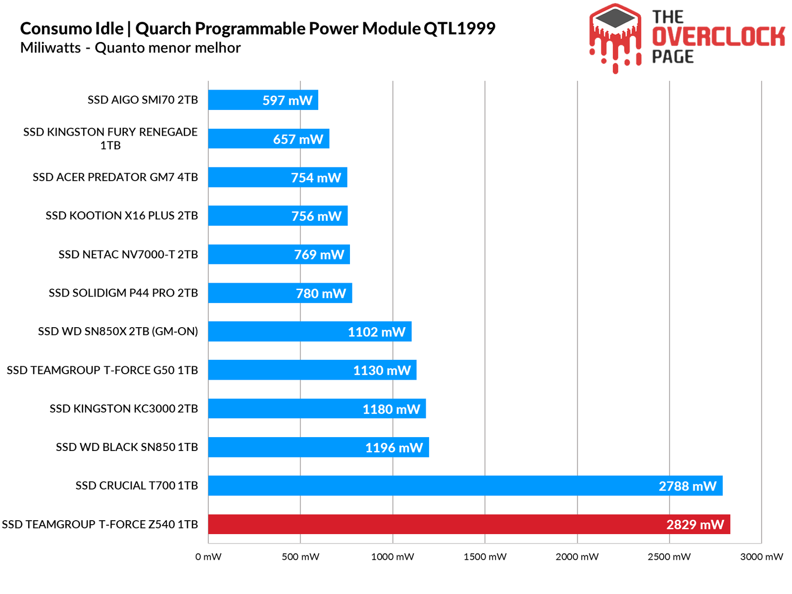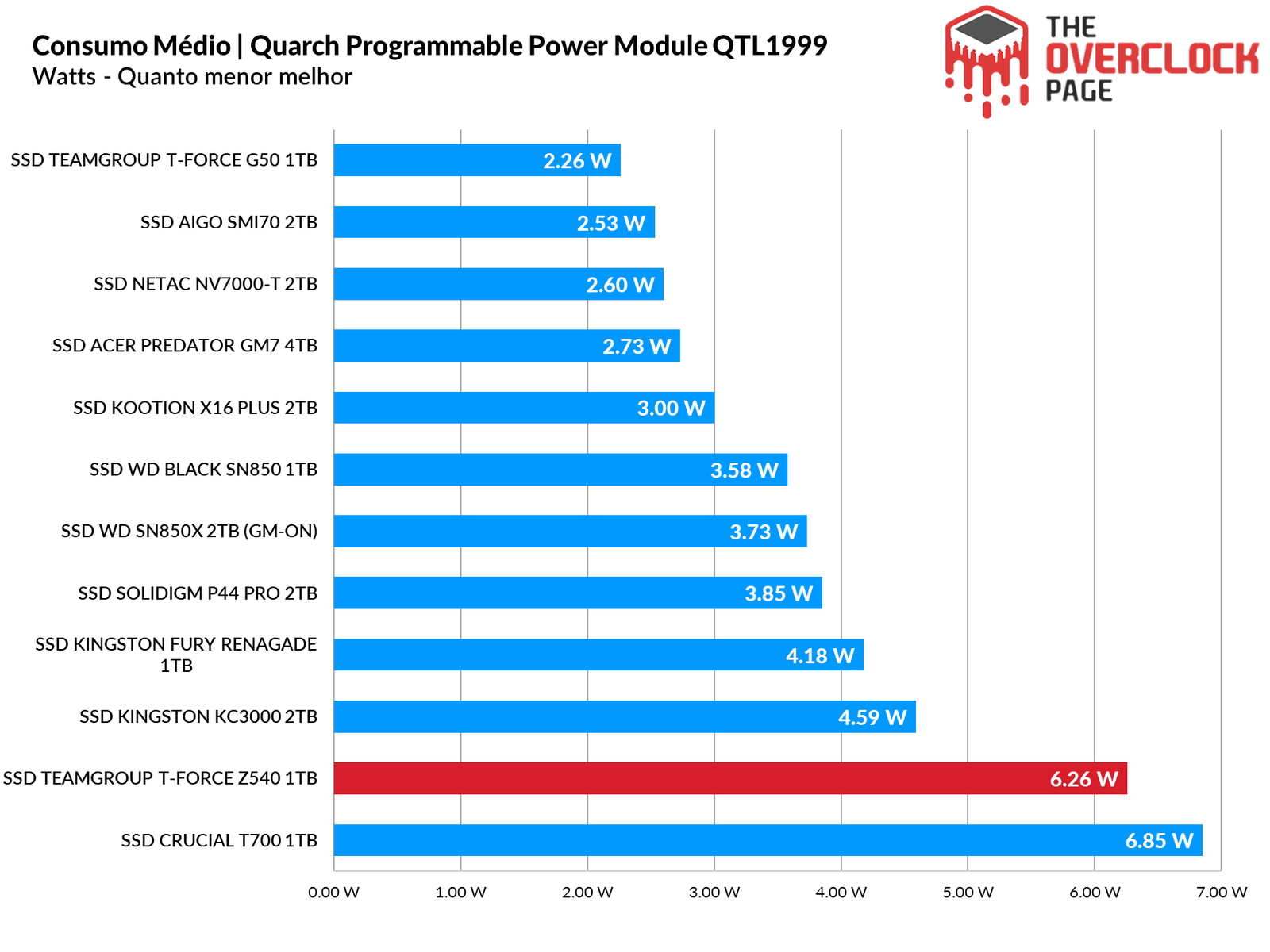 Durante nosso benchmark, o Z540 conseguiu ter um consumo quase 600mW menor que o T700 mas ainda sim, devido seu SLC Cache ser menor que o tamanho do nosso benchmark, fez com que ele passe a maior parte do benchmark trabalhando em suas velocidades nativas TLC, o que prejudicou demais sua eficiência.