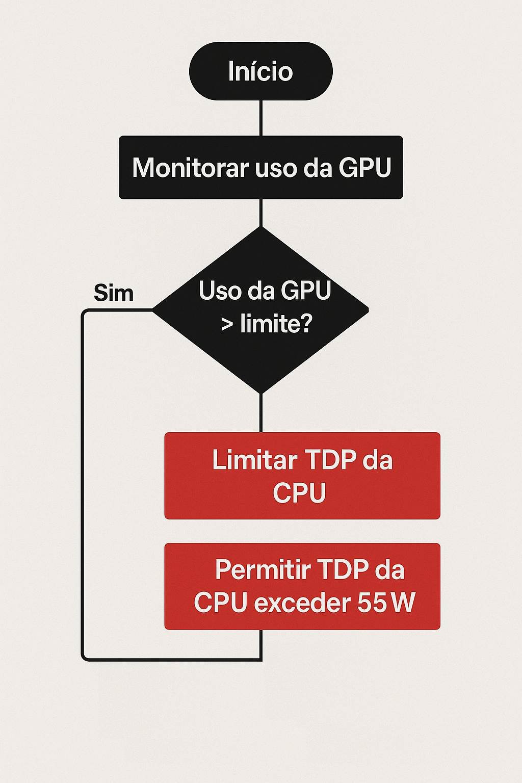 Com isso em mente, elaborei uma espécie de ‘algoritmo’ que ao menos no papel resolveria a questão: A ideia é monitorar o uso da GPU e ao exceder determinado valor, limitar o TDP da CPU em 55W para priorizar a GPU e quando o uso da GPU ficar abaixo desse valor, permitir que o TDP da CPU exceda os 55W.