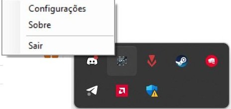 Como disse anteriormente, o software virou uma Tray App, o que significa que ele não fica na barra de tarefas e foi pensado em ser o mais ´silencioso´ possível durante a sua operação, dito isso, é possível acessar o menu clicando com o botão direito sobre o icone, o qual permite abrir um menu de configurações, sobre e sair.