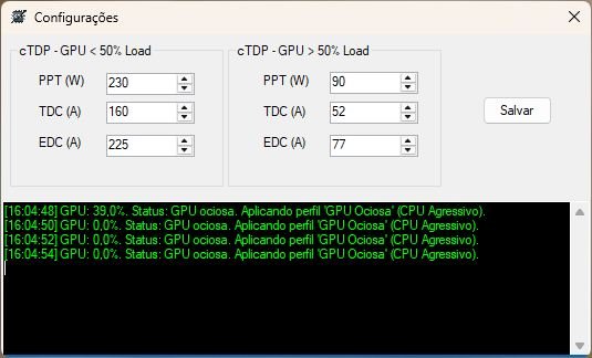 Nas configurações, é possível ajustar os parâmetros de PPT, TDC e EDC para cada uma das duas situações de uso da GPU, além de ter uma espécie de ´log´ mostrando o uso da GPU e qual perfil está sendo usado.