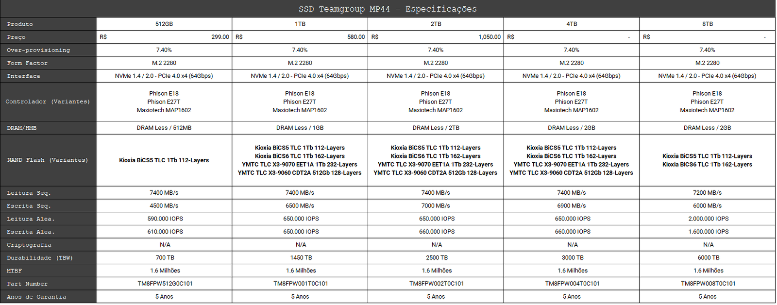 It comes in the M.2 form factor with a 64Gbps interface, meaning 4 PCIe 4.0 lanes, NVMe 1.4 protocol, and capacities ranging from 512GB up to 8TB. Its price usually falls around 70 USD for the 1TB unit and just over 120 USD for the 2TB model.