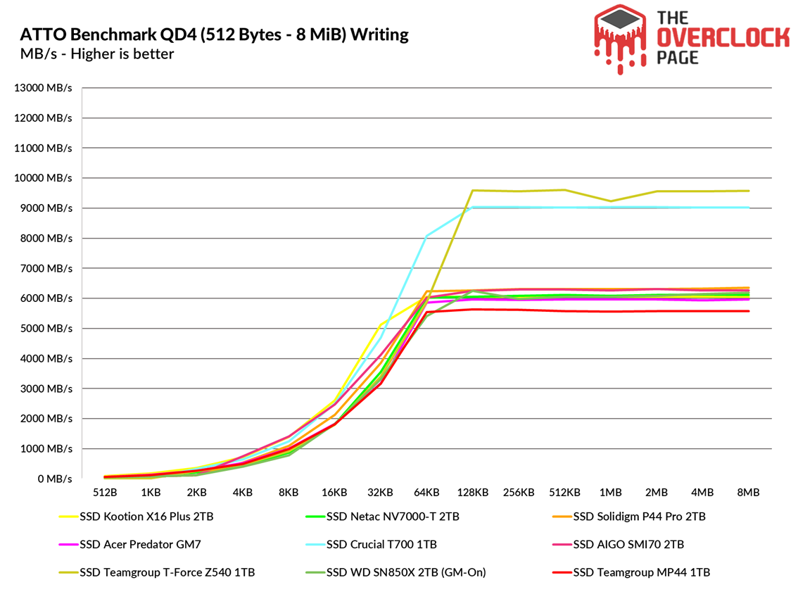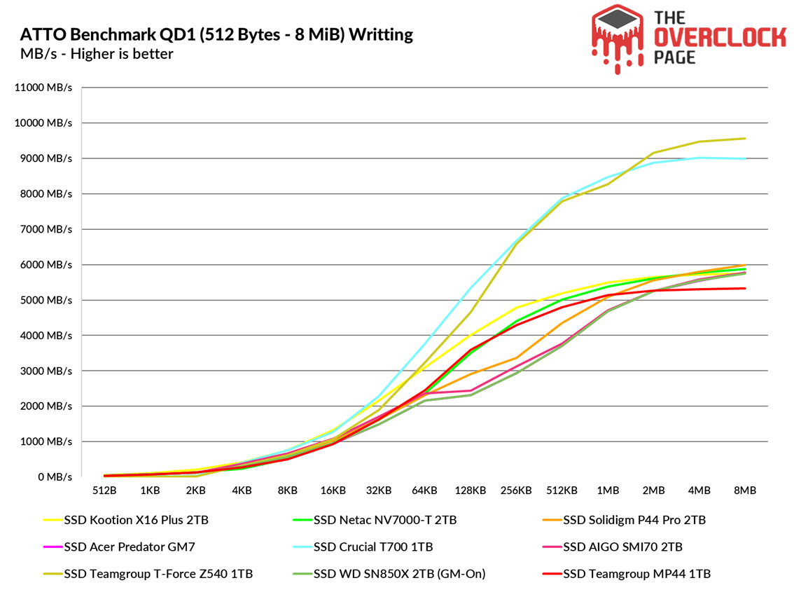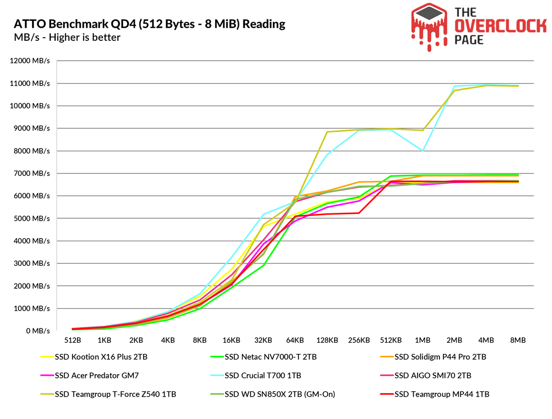 When testing its random speeds at a queue depth of 4, we observed that in reading it is basically a technical tie with the Crucial T700, while in writing its performance was slightly lower, yet still comparable to the T-Force Z540. It’s worth noting that both the T-Force and the Crucial are Gen5 models.