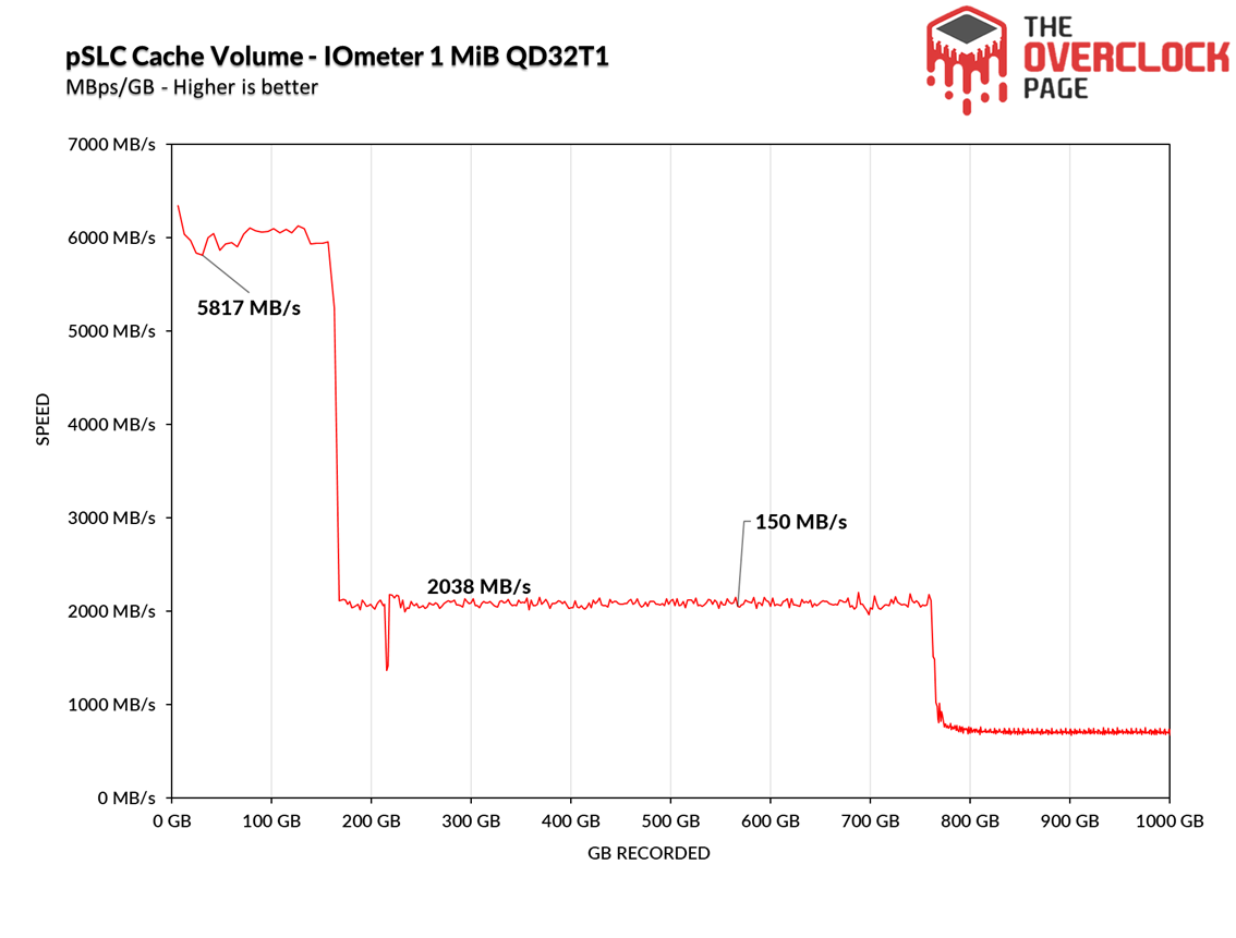 Using IOmeter, we can get an idea of the SLC cache size on this SSD, since manufacturers often do not disclose this value. From our tests, we found that it has a pSLC cache of approximately 170GB, maintaining an average speed of around 5817 MB/s until the buffer is exhausted.
