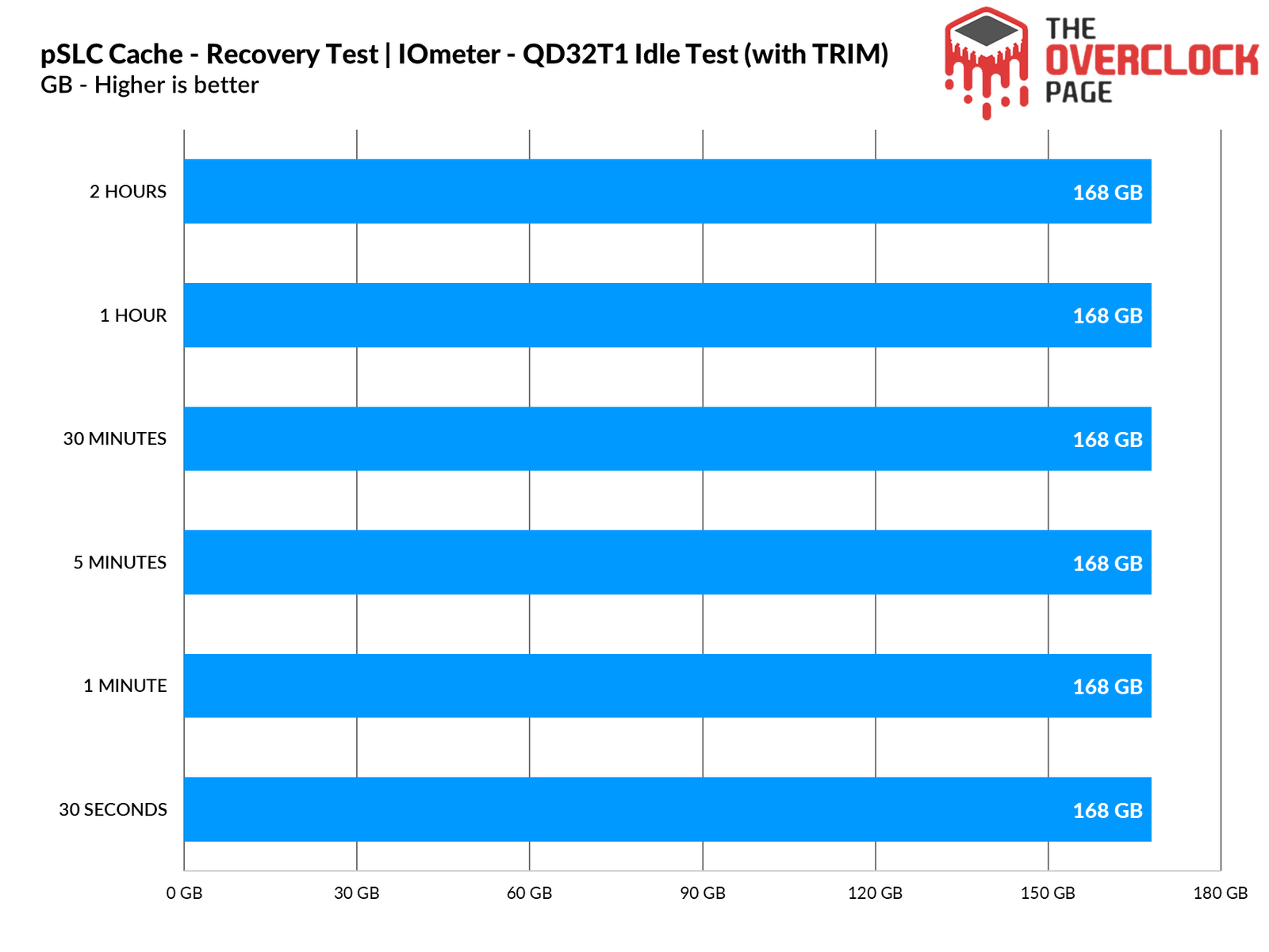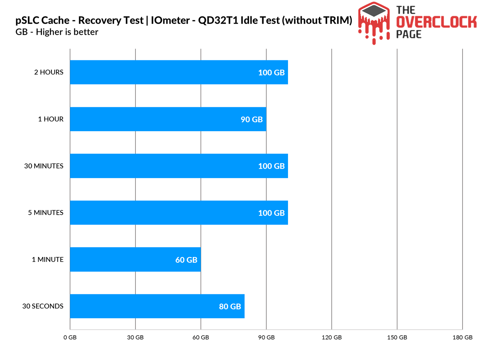 We also conducted a test to see how long the SSD would take to recover part of its buffer during our test suite, which ranges from 30 seconds to 2 hours in idle, comparing scenarios with TRIM and garbage collection enabled versus disabled. When tested without using TRIM/GC, we observed that it was able to recover about 80GB in just 30 seconds of idle time.