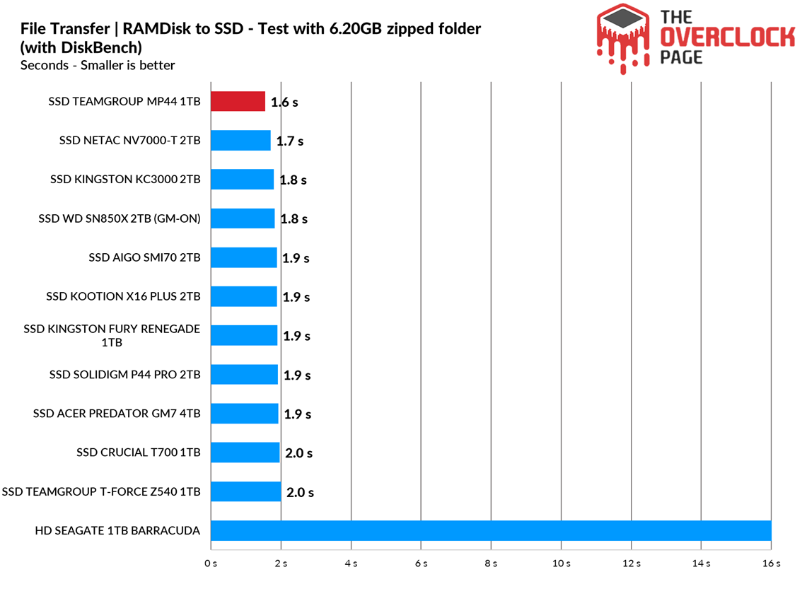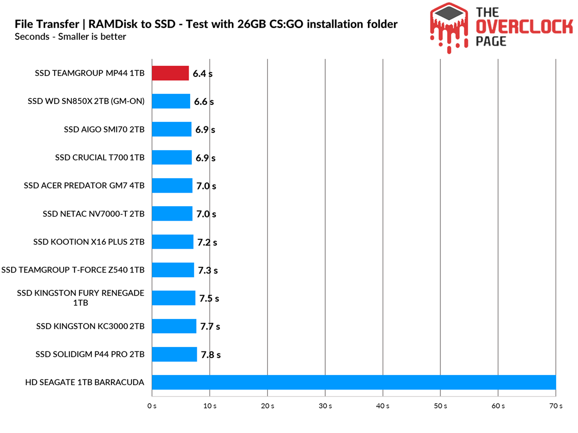 In this test, files were copied from a RAM Disk to the SSD to see how it performs. The test used the Windows 10 21H1 ISO of 6.25GB (1 file) along with the CSGO installation folder of 25.2GB.