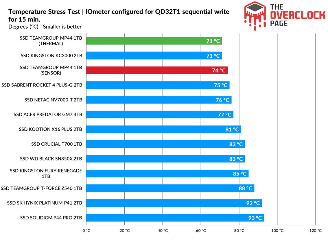 As seen above, this SSD has a default thermal limit of 95?°C, which is quite high—one might even recommend lowering it. The SSD performed well and did not exceed 74?°C according to its sensor, indicating a reasonable thermal margin, all without the need for a heatsink.