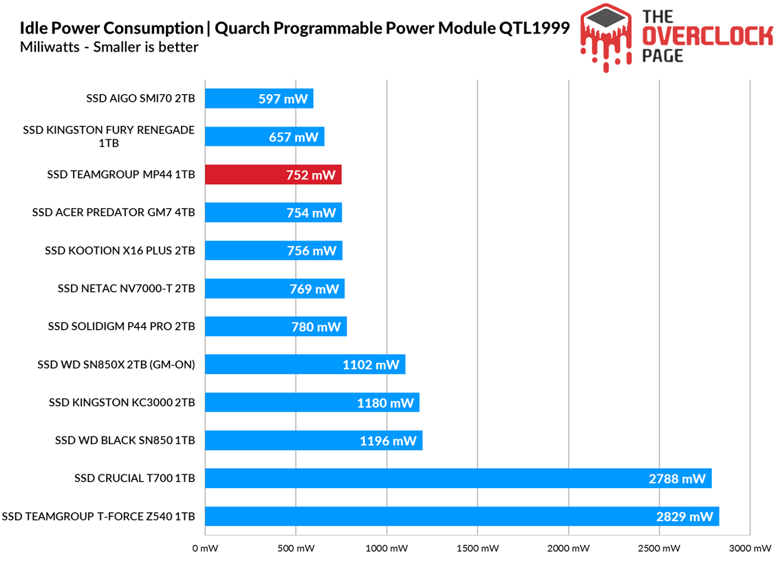 Finally, and most importantly, the idle test represents the scenario in which the vast majority of SSDs spend most of their daily usage. Even here, the MP44 performs excellently, staying below 770 mW, thanks to using the same power states as the NV7000-T, as mentioned earlier.